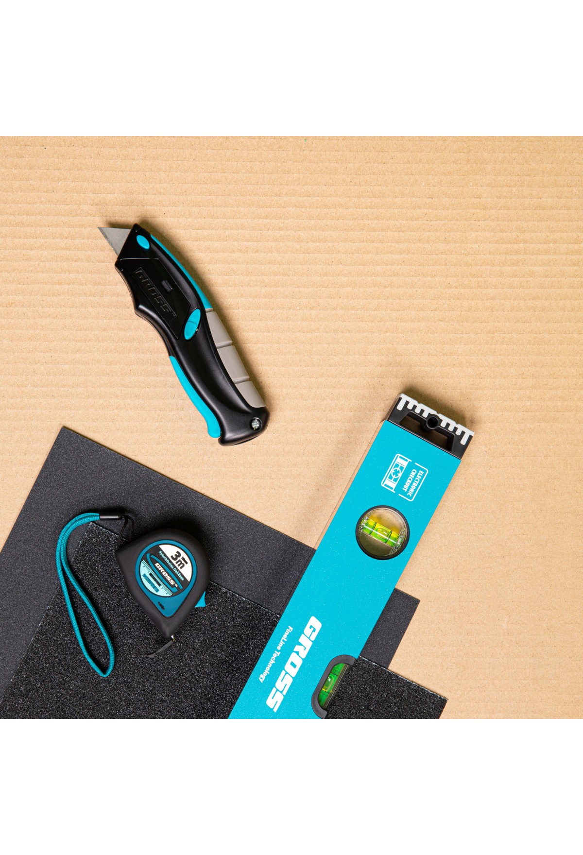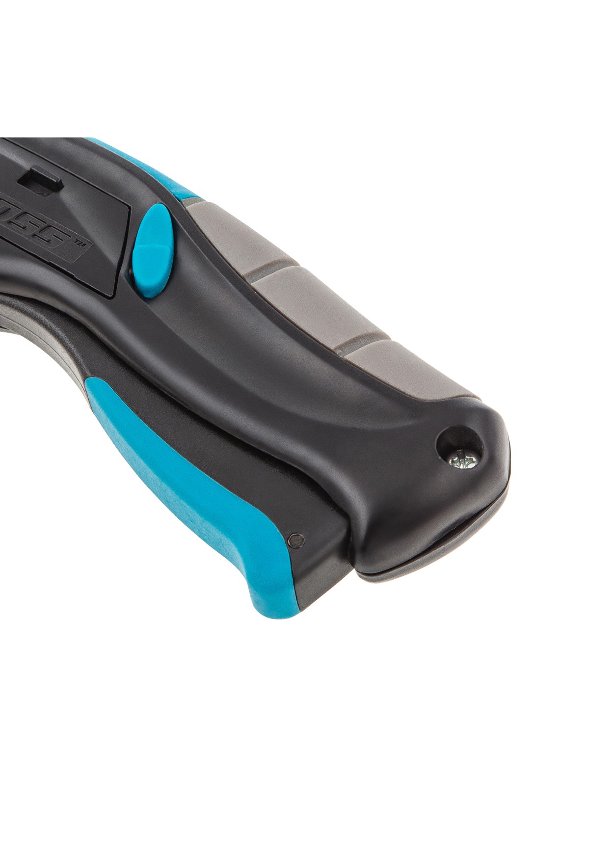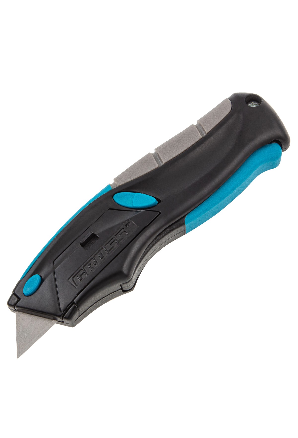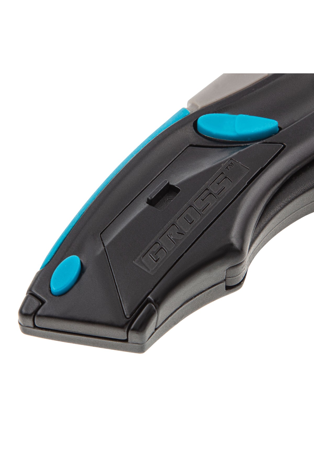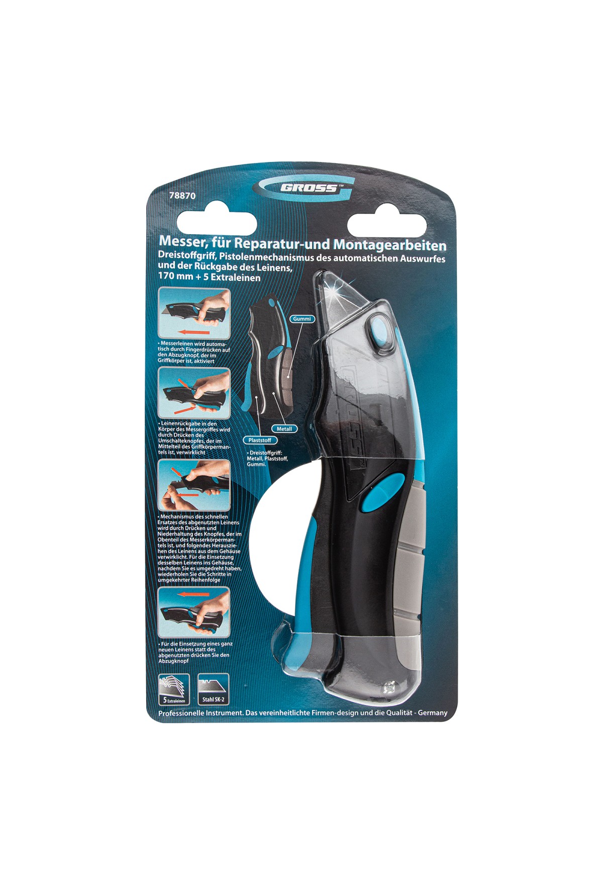 Ремонтно-монтажный нож пистолетного типа Gross 78870 длиной 170 мм, с трехкомпонентной рукояткой, автовыбросом/возвратом лезвия и 5 запасными лезвиями, применяется для разрезания линолеума, картона, кожи и других материалов. Лезвия изготовлены из высокопрочной японской стали SK-2, поэтому не ломаются и долго не тупятся. Инструмент предназначен для профессиональных работ, но может использоваться и в быту.