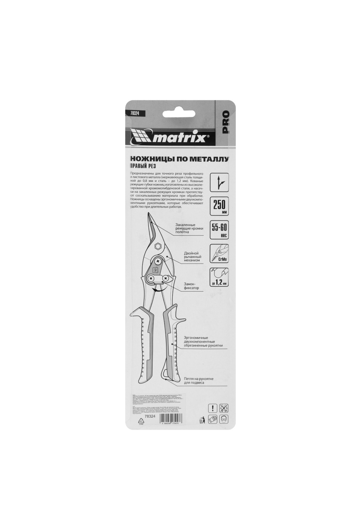 Ножницы по металлу Matrix PRO 78324 длиной 250 мм, с двухкомпонентными рукоятками, предназначены для правого реза листовых и профильных металлических заготовок, в том числе стали толщиной до 1,2 мм и нержавеющей стали толщиной до 0,8 мм. Двойной рычажный механизм позволяет прикладывать значительное усилие при резке толстого материала. Для удобства работы на корпусе имеется маркировка с указанием направления резания. Ножницы будут полезны в профессиональной и домашней мастерской.