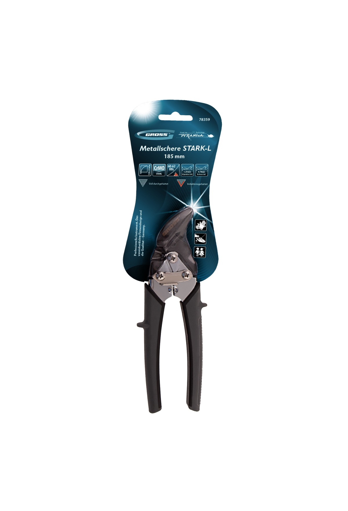 Ножницы по металлу Gross PIRANHA 78359 длиной 185 мм, из стали CrMo, с двухкомпонентными рукоятками, предназначены для прямого и криволинейного левого резания листовых заготовок. Выполняют точный рез цветных металлов, а также холоднокатаной стали толщиной до 1,2 мм и нержавеющей стали толщиной до 0,7 мм. Двойной рычажный механизм экономит усилия и повышает производительность ножниц. Общая длина инструмента составляет 185 мм, поэтому он удобен для работы в труднодоступных местах. Ножницы рекомендованы для профессионального применения, пригодятся также и в быту.