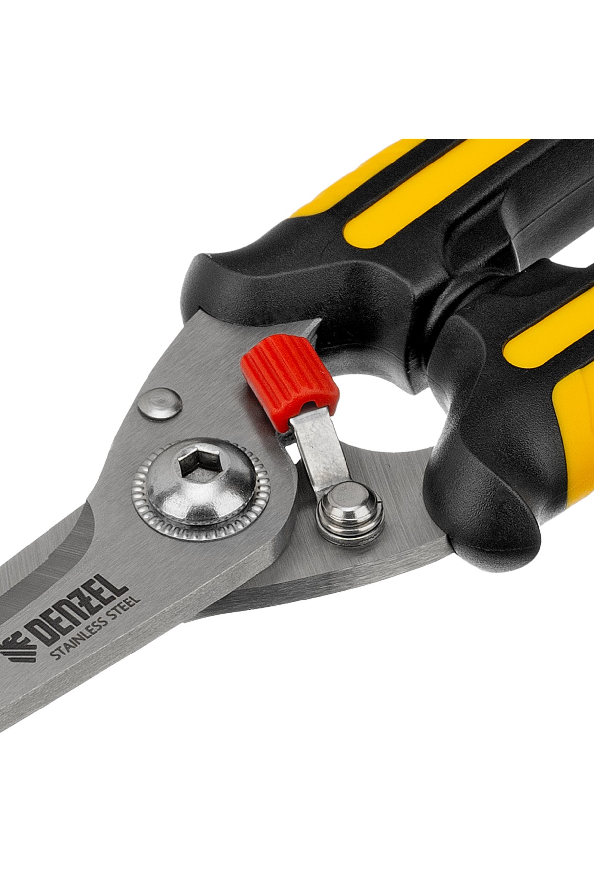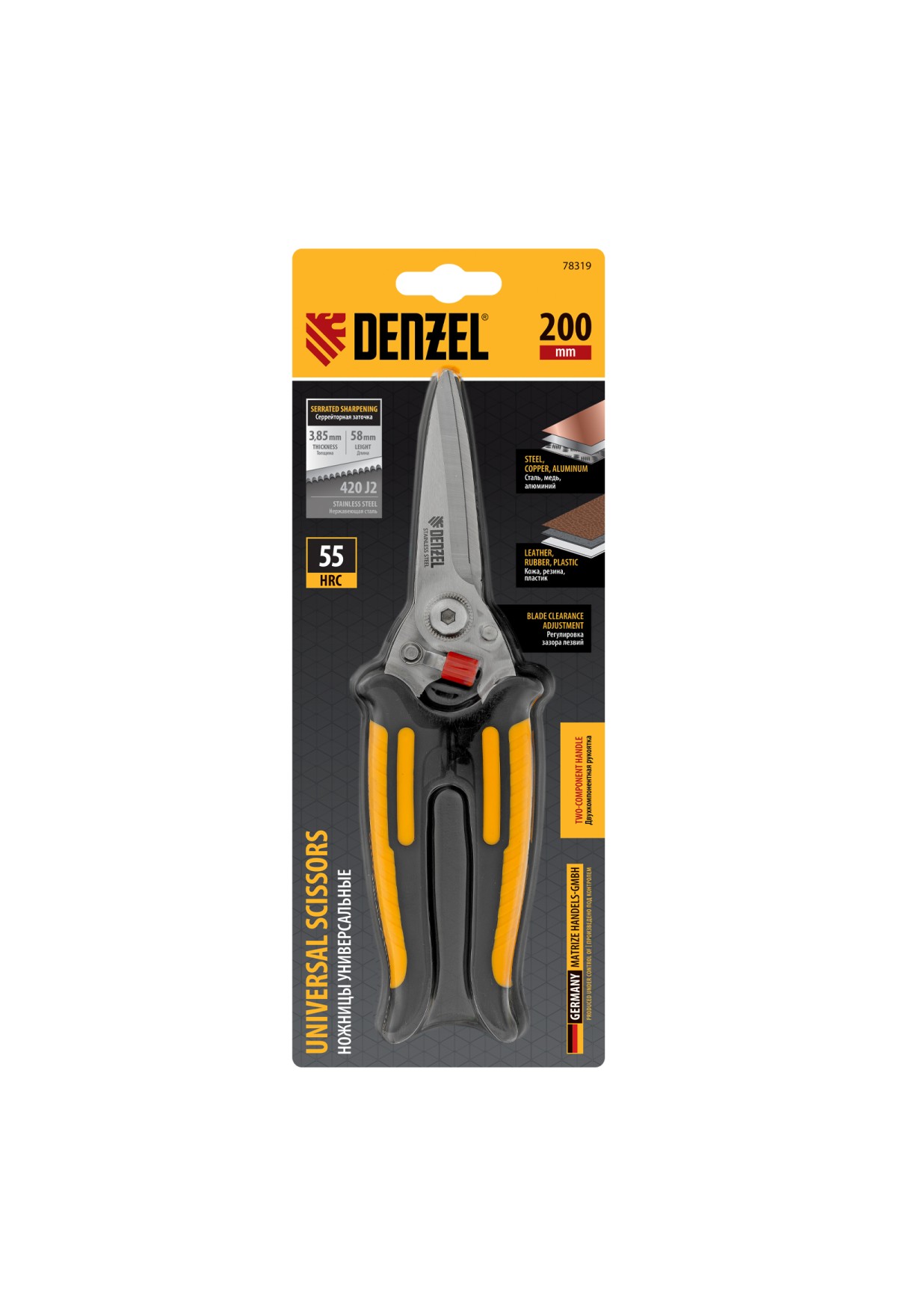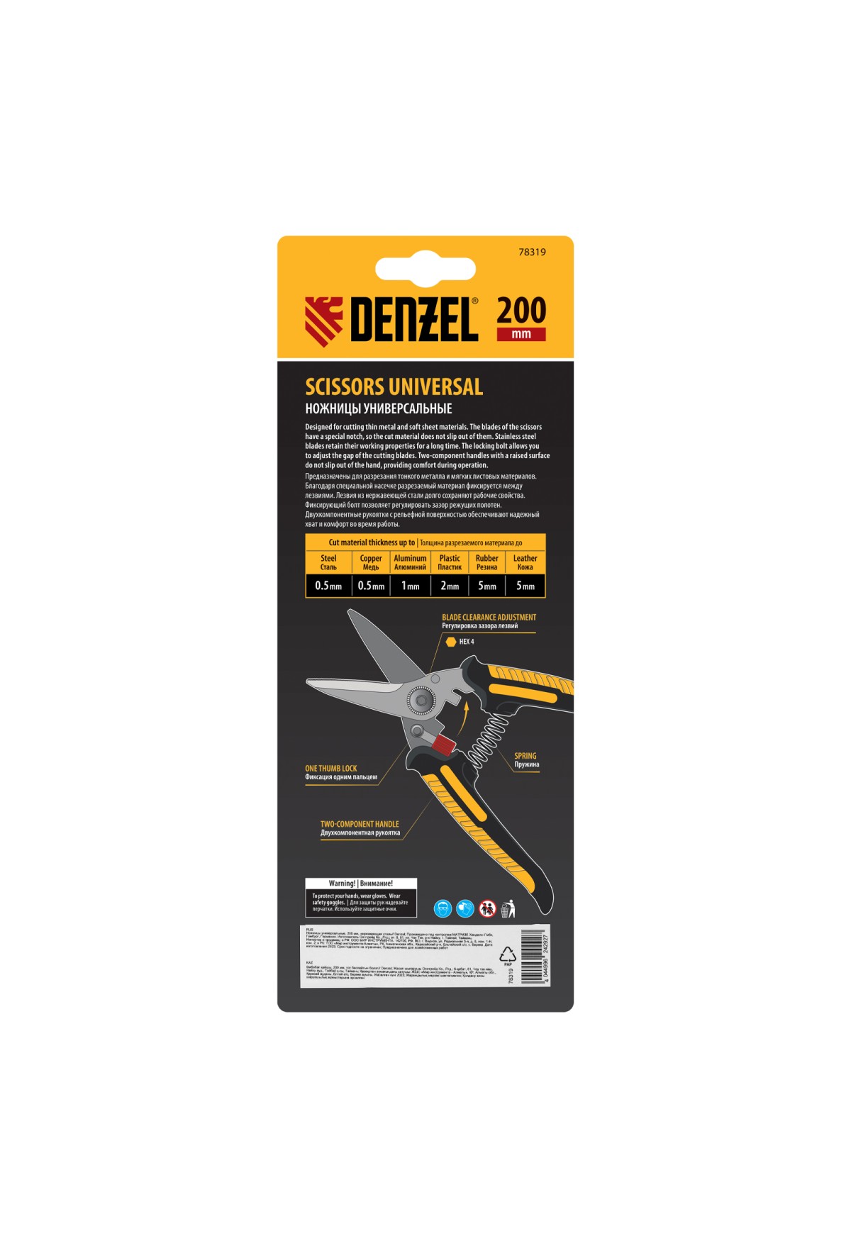 Универсальные ножницы Denzel 78319 длиной 200 мм — инструмент для разрезания тонкого металла и мягких материалов. Одно из лезвий имеет серрейторную (зубчатую) заточку, поэтому разрезаемый материал не выскальзывает из инструмента. Ножницы подходят для выполнения разнообразных работ: на даче помогут разрезать стальную сетку с небольшим диаметром проволоки, в походе — ветки или рыбу, во время мелкого ремонта или занятий творчеством — провода, кожу, резину, картон, бумажную лозу и другие материалы.