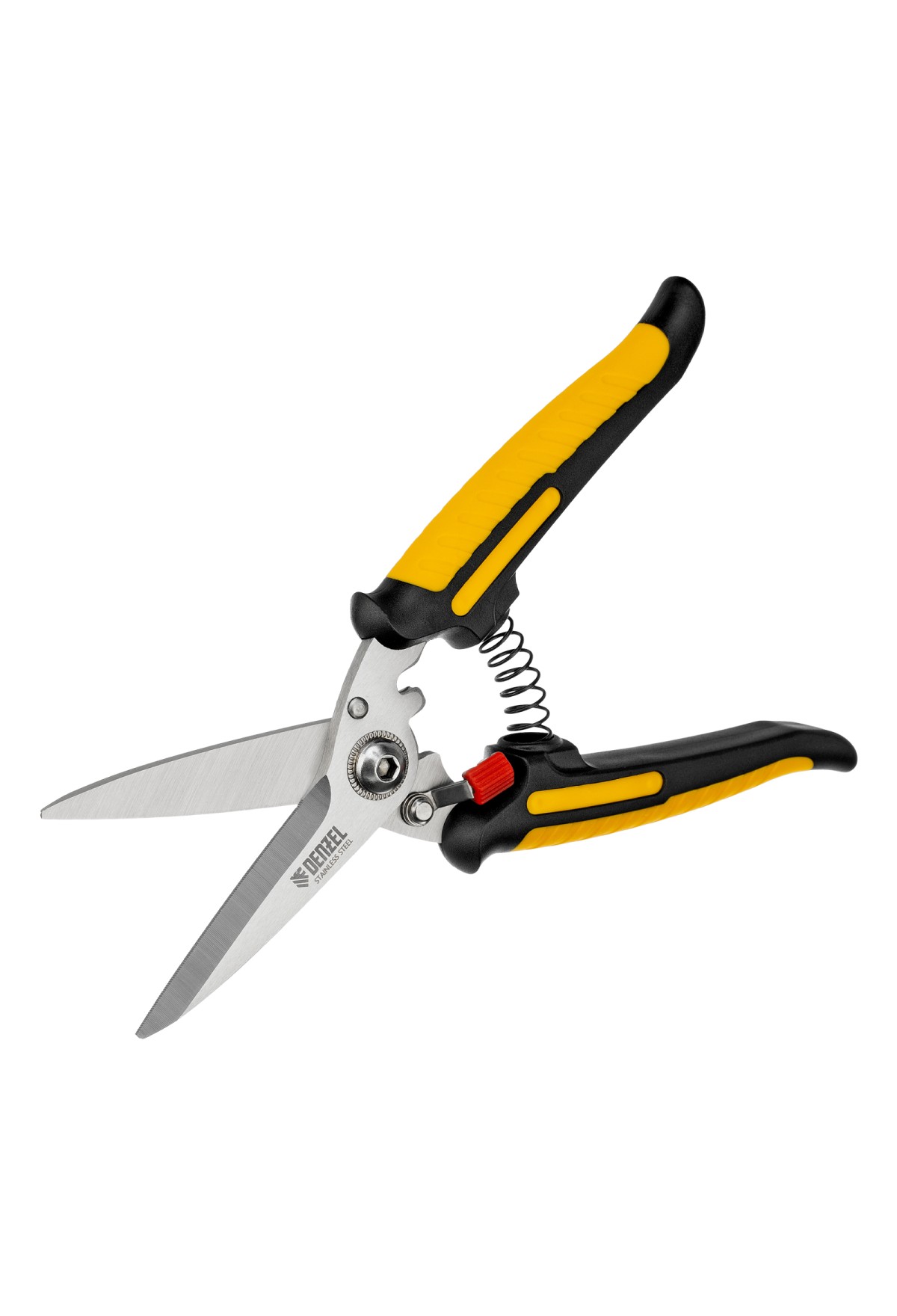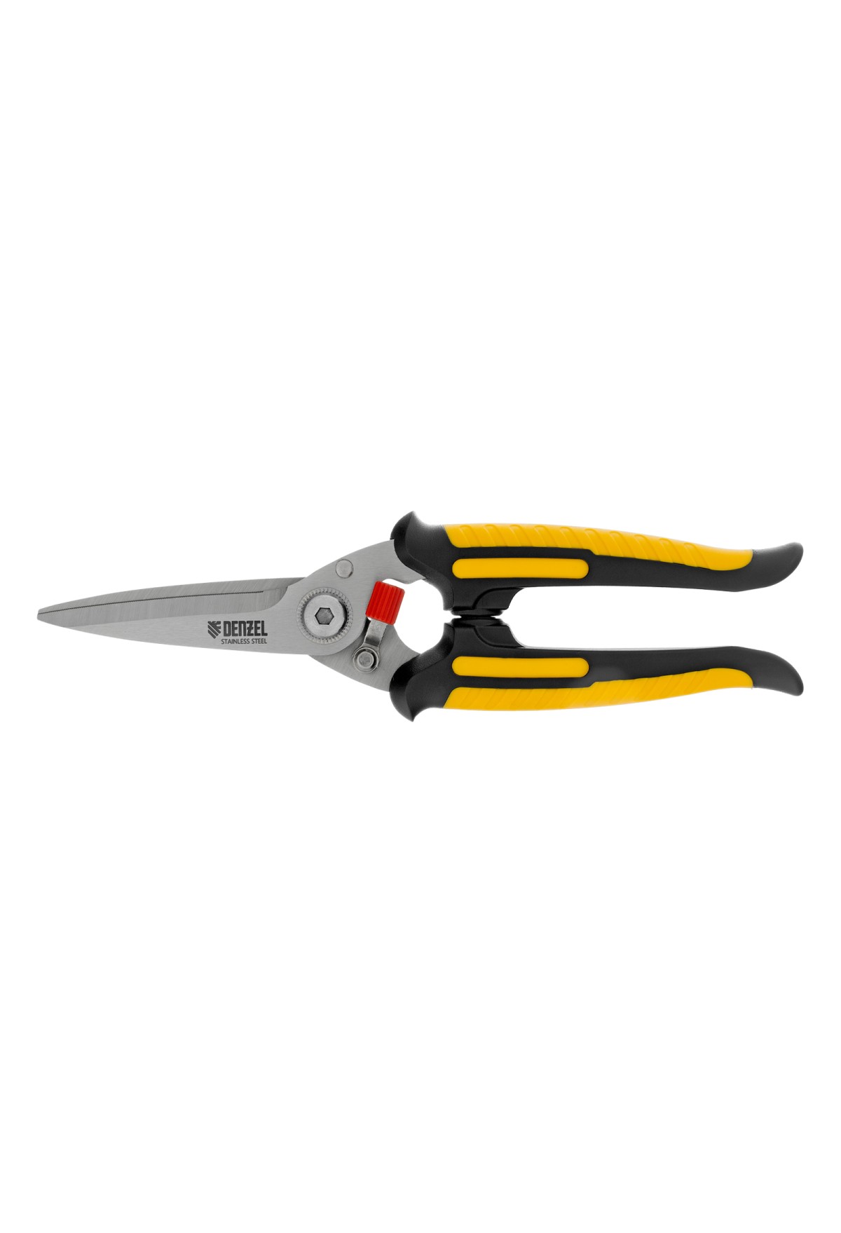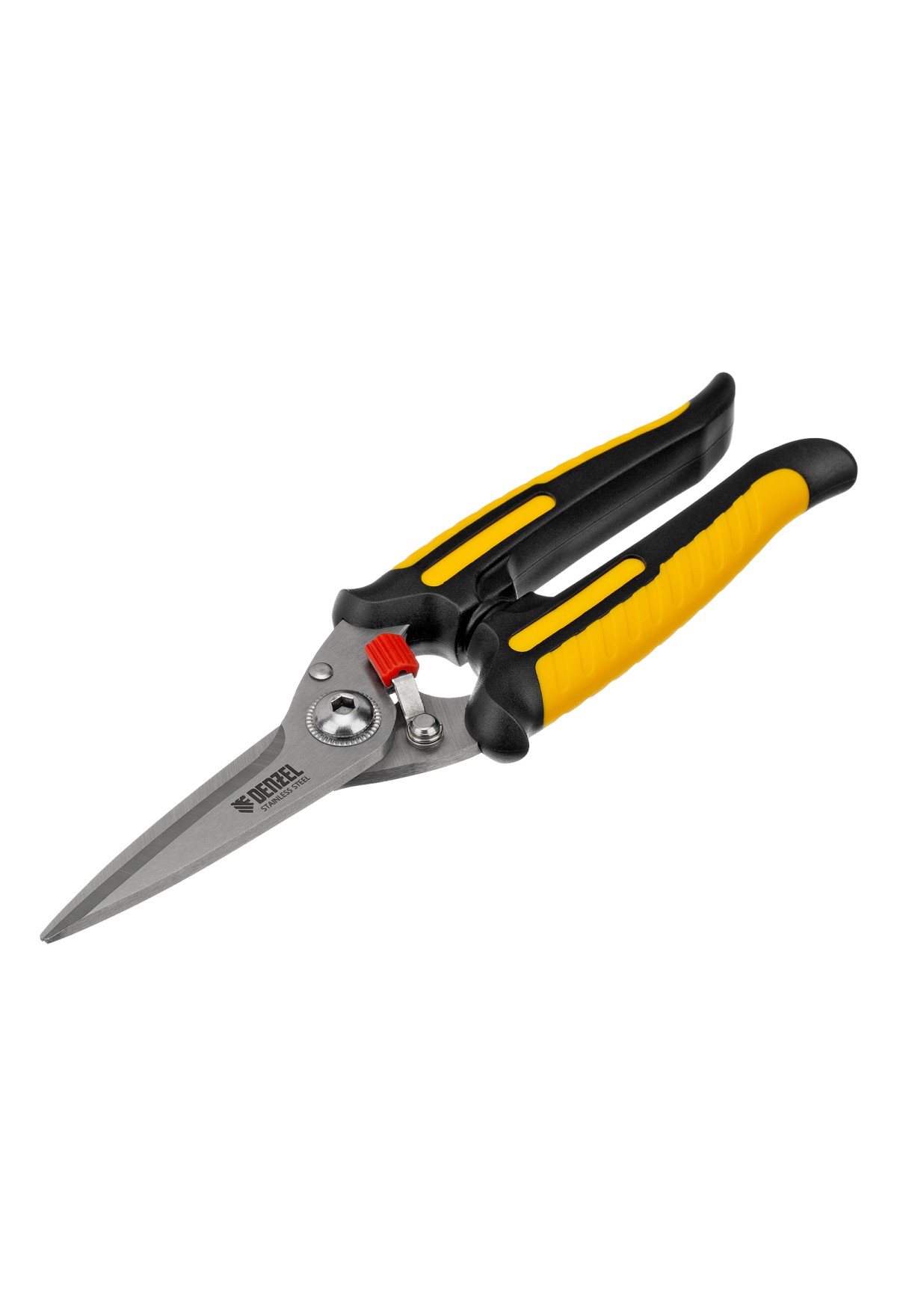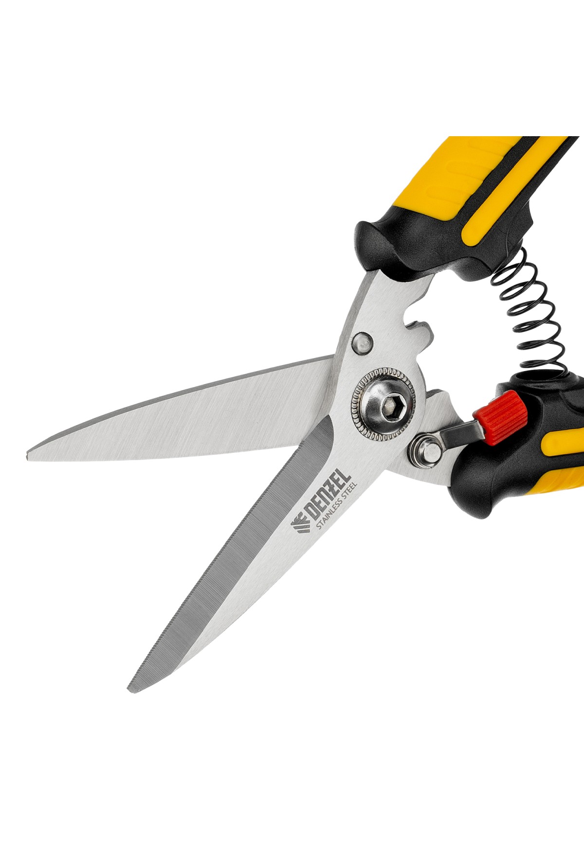 Универсальные ножницы Denzel 78319 длиной 200 мм — инструмент для разрезания тонкого металла и мягких материалов. Одно из лезвий имеет серрейторную (зубчатую) заточку, поэтому разрезаемый материал не выскальзывает из инструмента. Ножницы подходят для выполнения разнообразных работ: на даче помогут разрезать стальную сетку с небольшим диаметром проволоки, в походе — ветки или рыбу, во время мелкого ремонта или занятий творчеством — провода, кожу, резину, картон, бумажную лозу и другие материалы.