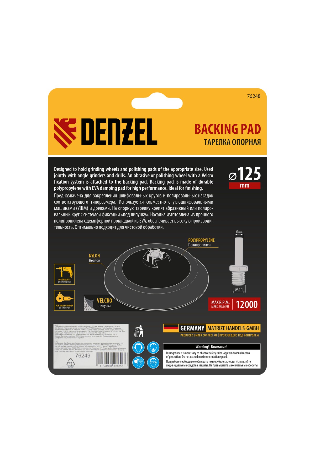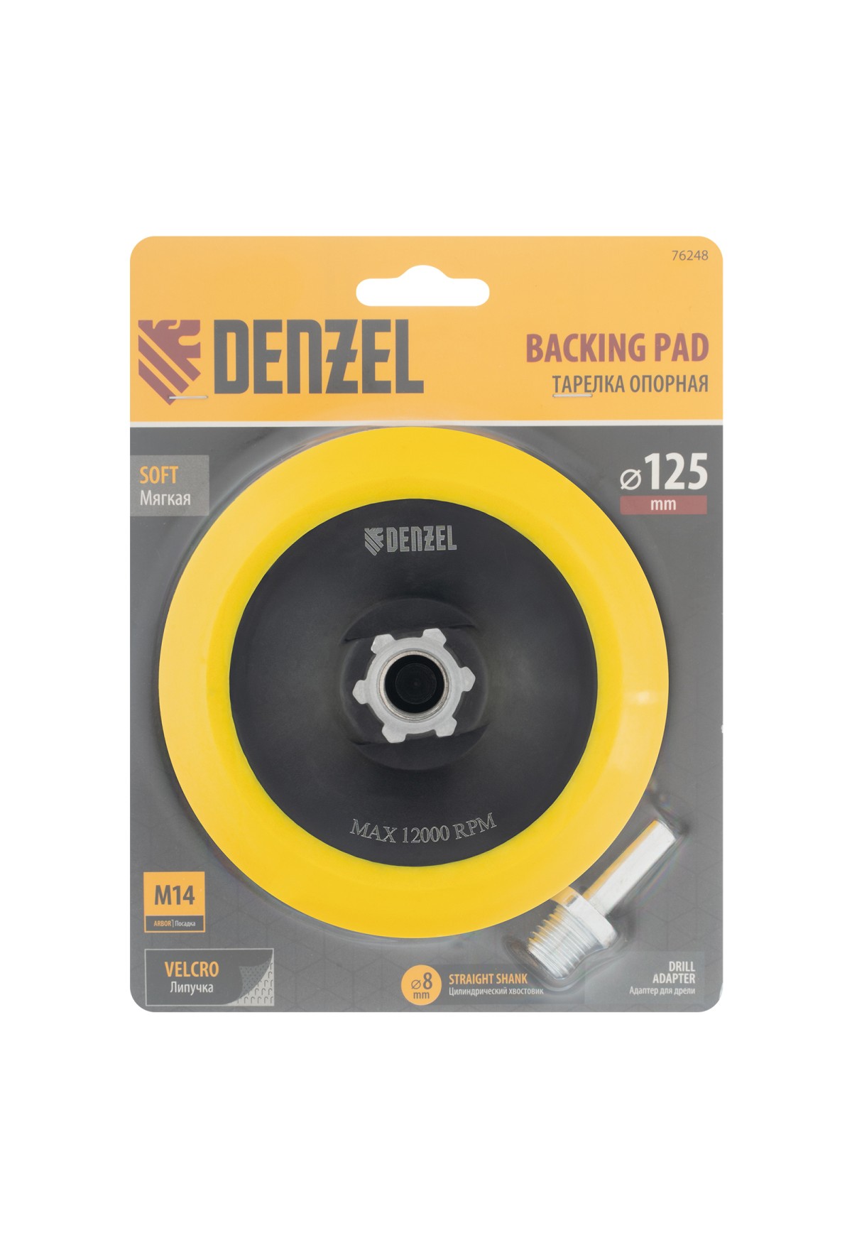 Технические характеристики Тарелка опорная для дрели и УШМ с липучкой, 125 мм, мягкая, с адаптером c М14 на d8 Denzel