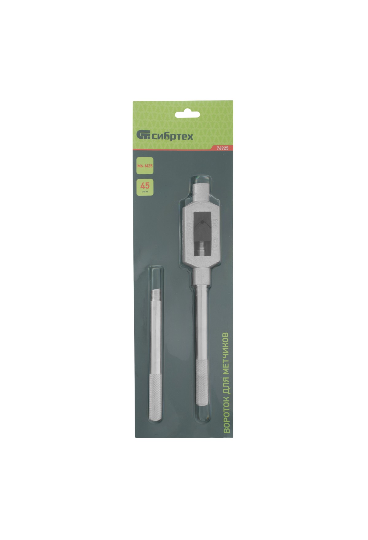 Вороток Сибртех 76925 подходит для зажима метчиков, используемых для ручного нарезания внутренней резьбы М6-М25 в отверстиях и цилиндрических деталях. Применяется во время ремонта резьбовых соединений, пригодится в мастерской или гараже.
