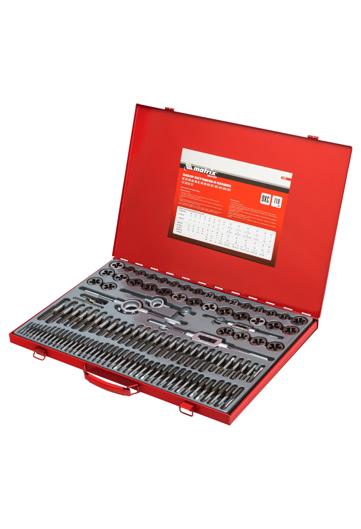 Комплектация Набор метчиков и плашек М2-М18 - 110 штМеталлический кейс Matrix - 1 шт
