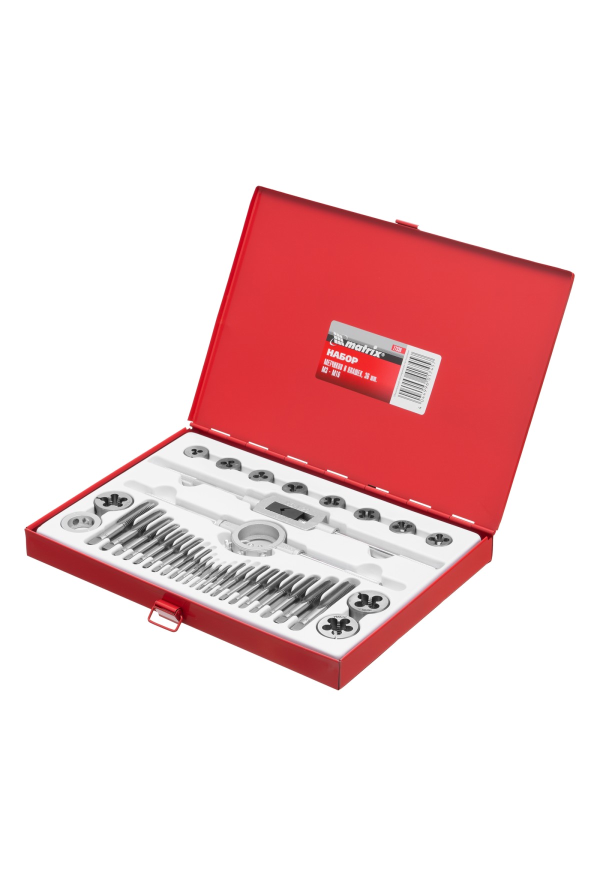 Набор метчиков и плашек М3-М16 Matrix 77339 состоит из 36 предметов — резьбонарезных инструментов, воротка и плашкодержателя с переходником. Используется для создания наружной и внутренней резьбы в сквозных и глухих отверстиях металлических деталей. Также с его помощью можно восстанавливать поврежденные резьбовые участки. Набор поставляется в металлическом кейсе, поэтому не потеряется при хранении или транспортировке. Будет полезен в слесарной мастерской, а также пригодится для проведения бытового ремонта.