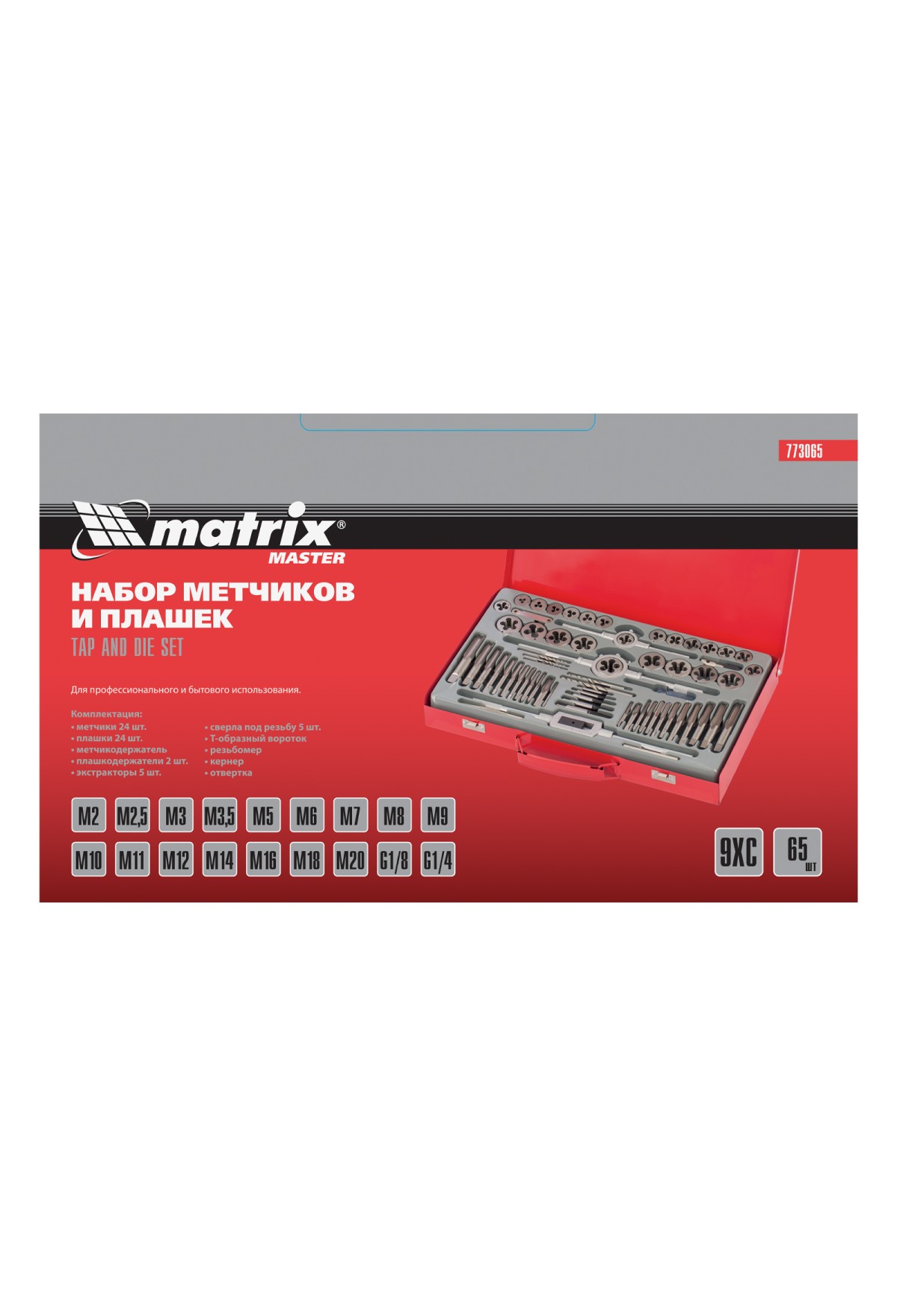 Набор метчиков и плашек Matrix 773065 для резьбы М2-М20 включает 65 предметов, помещенных в металлический кейс. Инструменты используются для создания внутренней и внешней резьбы различного диаметра и шага. Отвертка служит для монтажа и демонтажа резьбовых соединений, а экстракторы — для извлечения сломавшихся болтов и шпилек. Набор предназначен для проведения слесарных работ, будет полезен во время ремонта автомобиля.