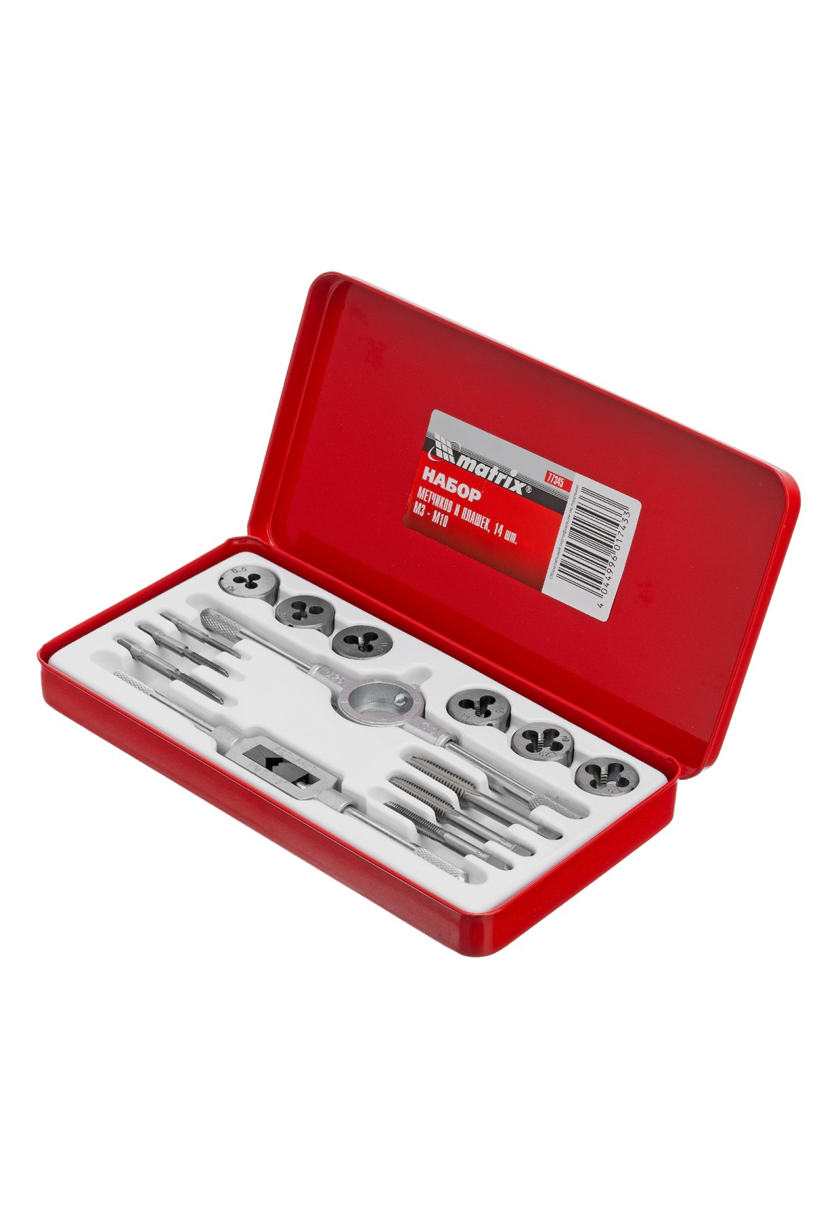 Набор метчиков и плашек М3-М10 Matrix 77345 состоит из 14 предметов — резьбонарезных инструментов, воротка и плашкодержателя. Используется для создания наружной и внутренней резьбы в сквозных и глухих отверстиях металлических деталей. Также с его помощью можно восстанавливать поврежденные резьбовые участки. Набор поставляется в металлическом кейсе, поэтому не потеряется при хранении или транспортировке. Будет полезен в слесарной мастерской, а также пригодится для проведения бытового ремонта.