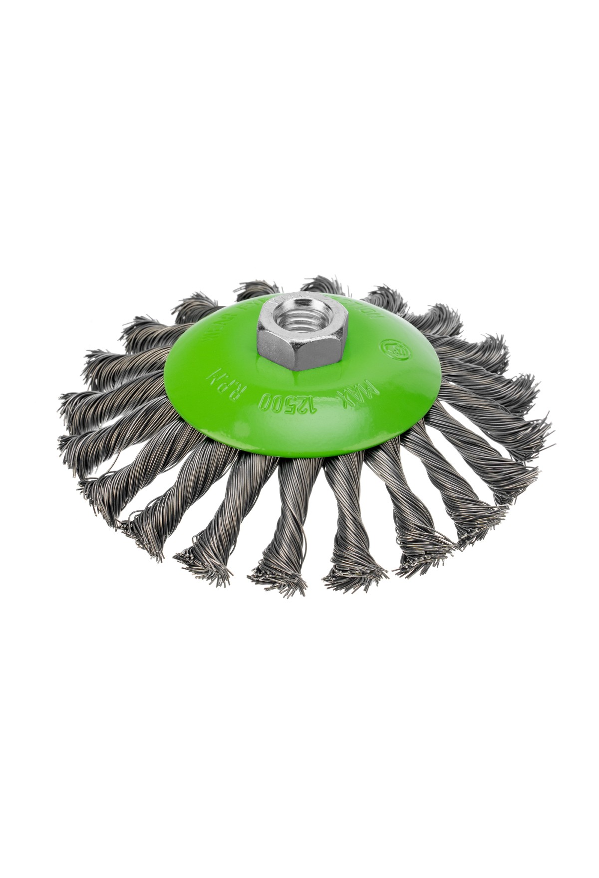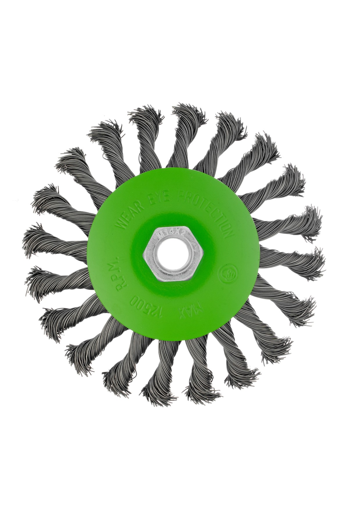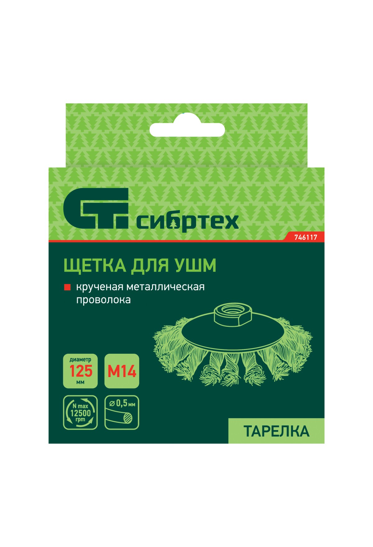Щетка Сибртех «тарелка» 746117 диаметром 125 мм, с щетиной из крученой проволоки толщиной 0,5 мм, устанавливается на УШМ при помощи гайки М14. Выполнена в форме тарелки, за счет чего подходит для грубой (черновой) обработки плоских и угловых поверхностей. Удаляет ржавчину, загрязнения, лакокрасочные покрытия, подходит для зачистки сварных швов. Использование на скорости до 12500 об/мин позволяет продлить срок службы насадки.