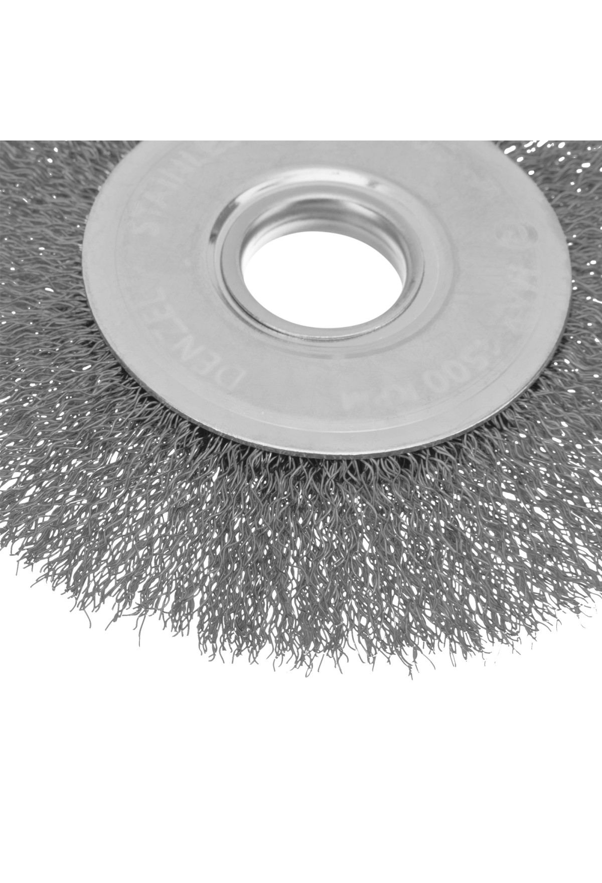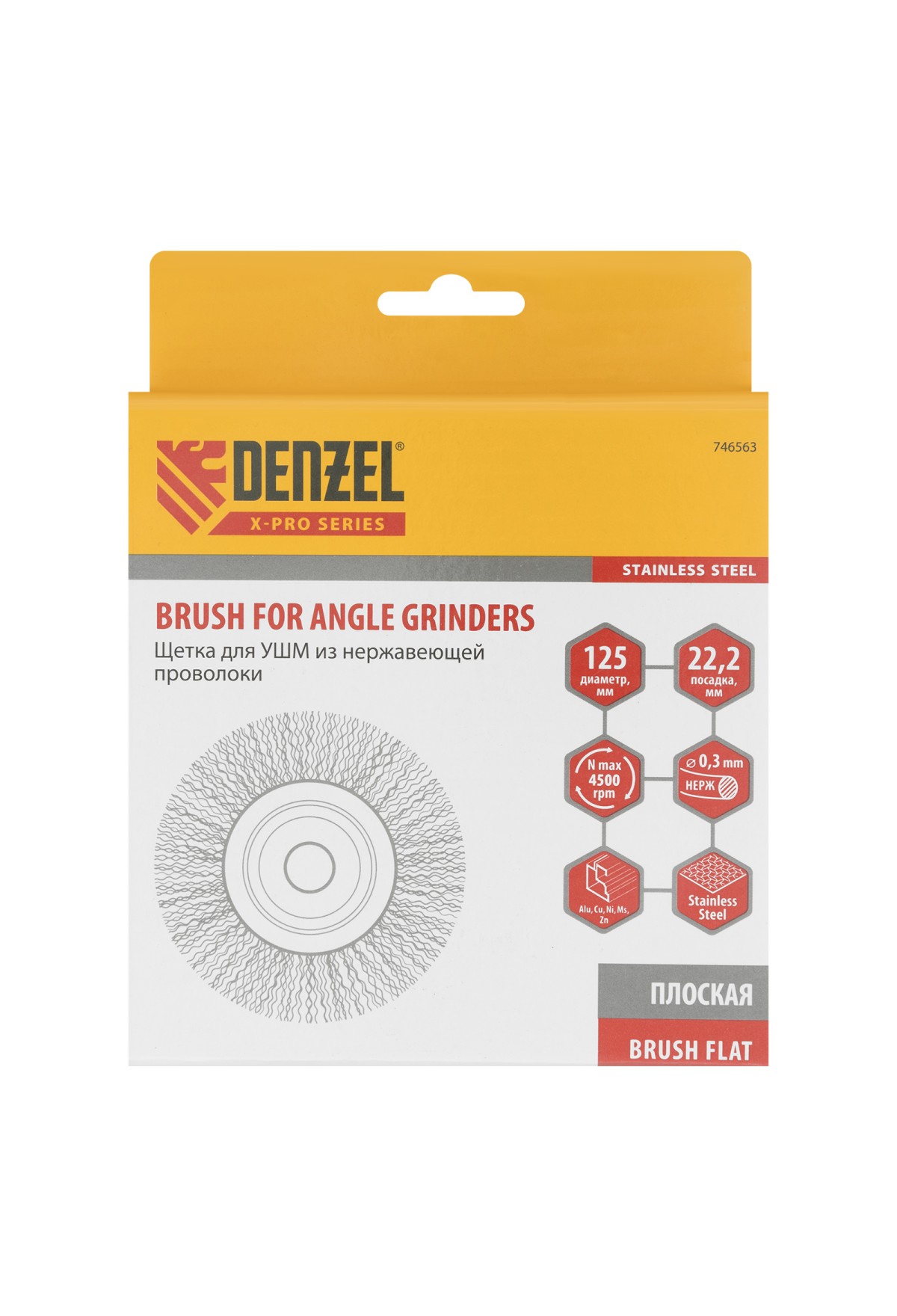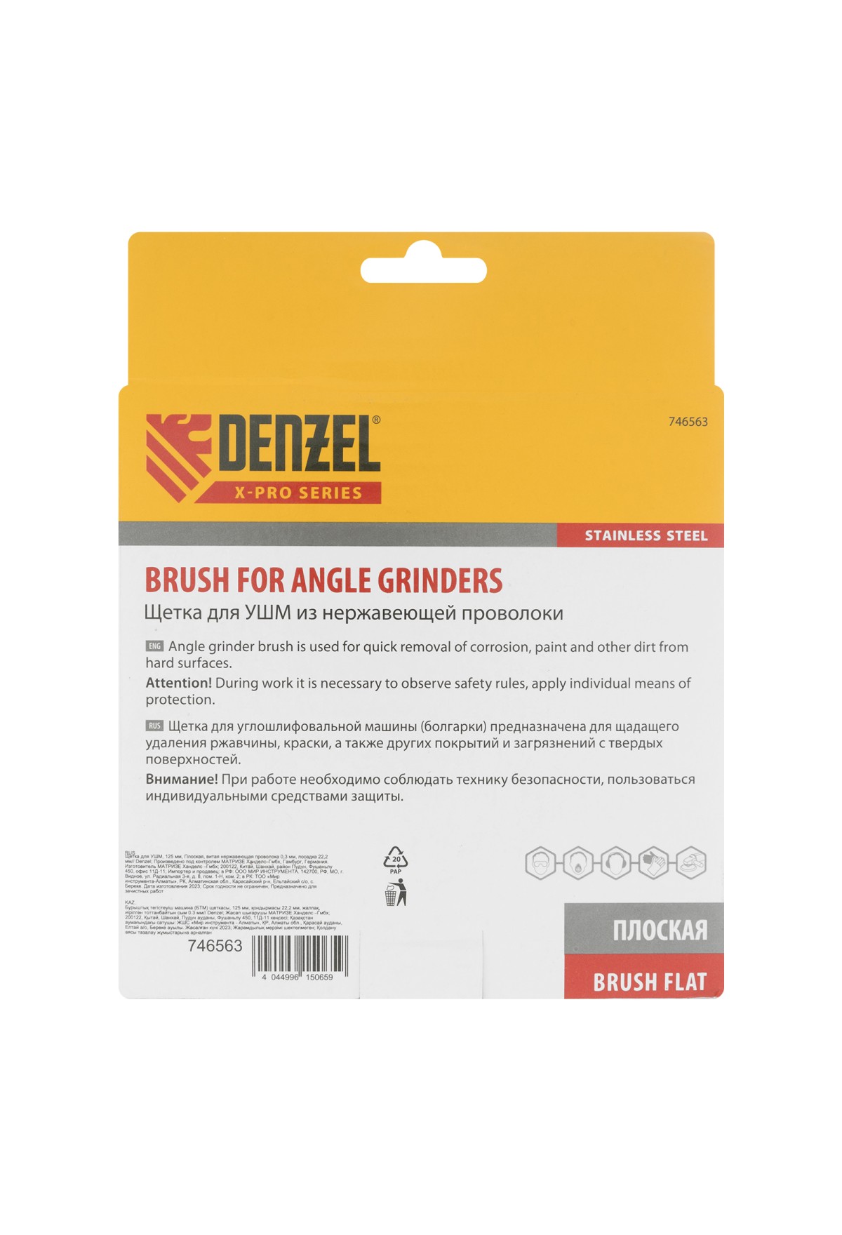 Плоская щетка для УШМ Denzel 746563 диаметром 125 мм, с щетиной из витой нержавеющей проволоки 0,3 мм, с посадкой 22,2 мм, постепенно снимает тонкий слой материала, поэтому ее используют для щадящей обработки металлических, деревянных, пластиковых поверхностей, а также изделий из нержавеющей стали. Щетка удаляет ржавчину, загрязнения, остатки лакокрасочных покрытий из труднодоступных мест, пазов и углов. Оснастка с посадкой 22,2 мм устанавливается на фланец углошлифовальной машины, что удобно для длительной работы без смены насадок. Рекомендуемая максимальная скорость вращения составляет 4500 об/мин. Во время работы следует использовать средства индивидуальной защиты. Щетку применяют в строительстве, машиностроении, а также в быту.