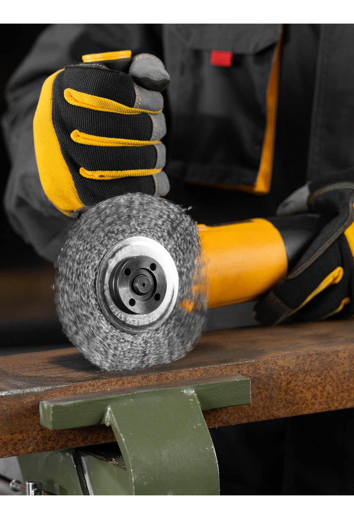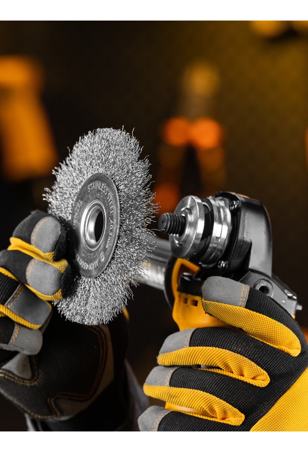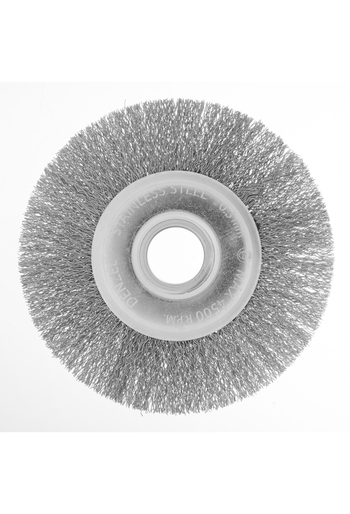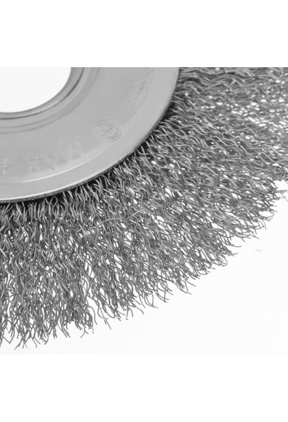 Плоская щетка для УШМ Denzel 746563 диаметром 125 мм, с щетиной из витой нержавеющей проволоки 0,3 мм, с посадкой 22,2 мм, постепенно снимает тонкий слой материала, поэтому ее используют для щадящей обработки металлических, деревянных, пластиковых поверхностей, а также изделий из нержавеющей стали. Щетка удаляет ржавчину, загрязнения, остатки лакокрасочных покрытий из труднодоступных мест, пазов и углов. Оснастка с посадкой 22,2 мм устанавливается на фланец углошлифовальной машины, что удобно для длительной работы без смены насадок. Рекомендуемая максимальная скорость вращения составляет 4500 об/мин. Во время работы следует использовать средства индивидуальной защиты. Щетку применяют в строительстве, машиностроении, а также в быту.