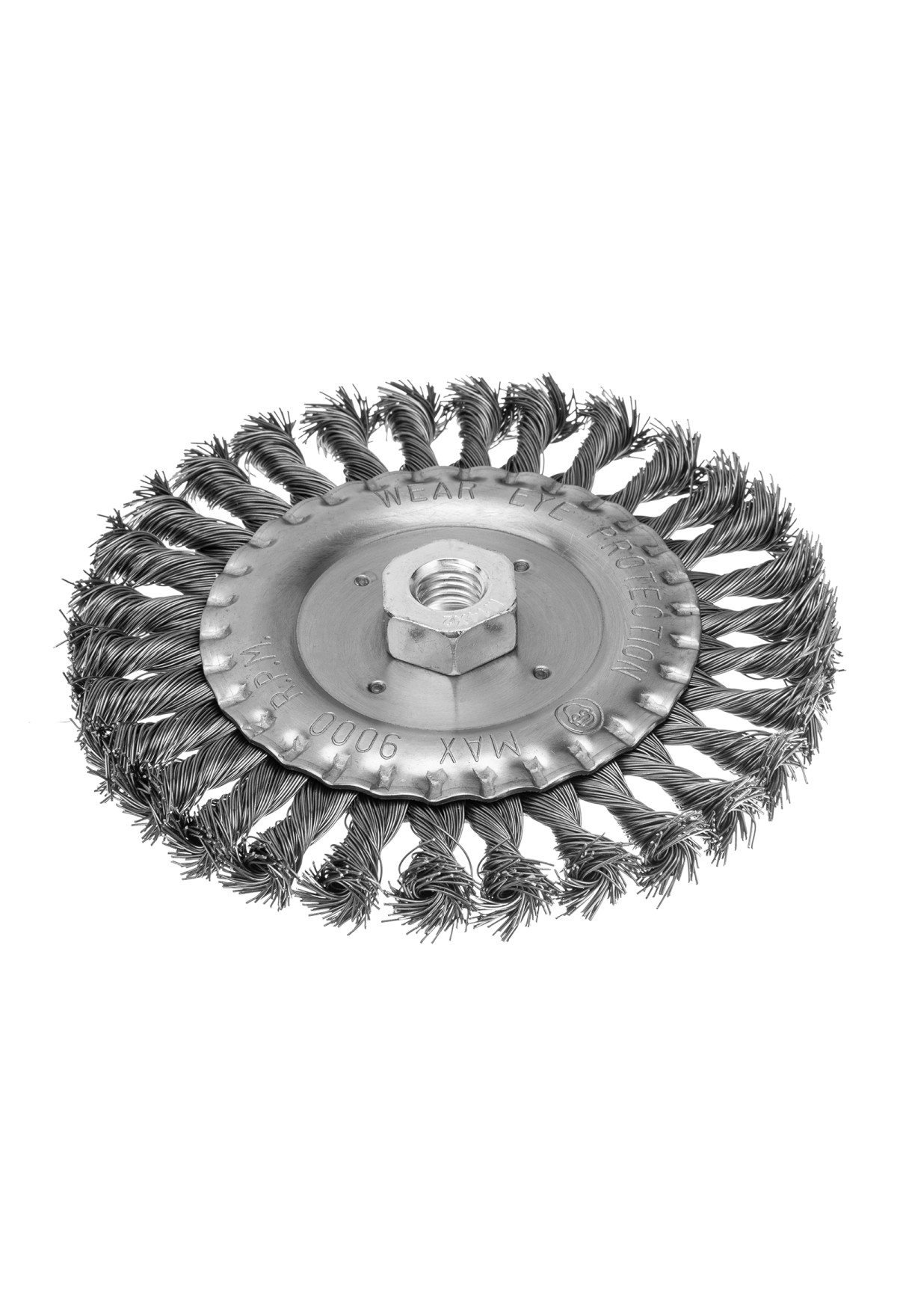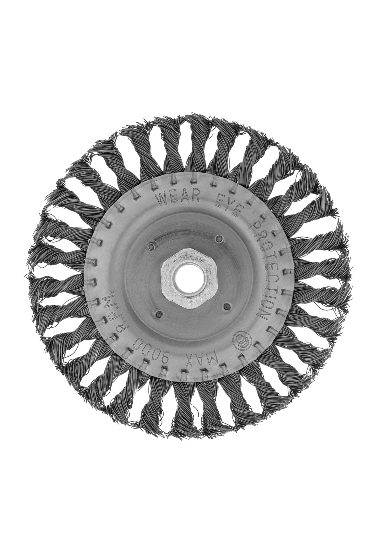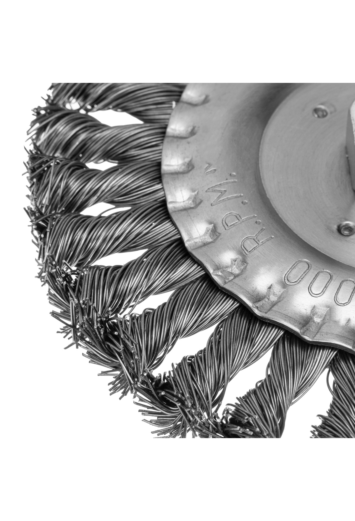 Плоская щетка Matrix 74641 диаметром 150 мм, с щетиной из крученой проволоки толщиной 0,5 мм и гайкой М14, — оснастка для УШМ, предназначенная для грубой (черновой) обработки поверхностей. Максимально допустимая скорость вращения шпинделя — 9000 об/мин. Щетка позволяет снять толстый слой ржавчины, лакокрасочных покрытий, загрязнений, а также зачистить сварные швы. Плоская форма удобна для обработки углов, изгибов и других труднодоступных мест.