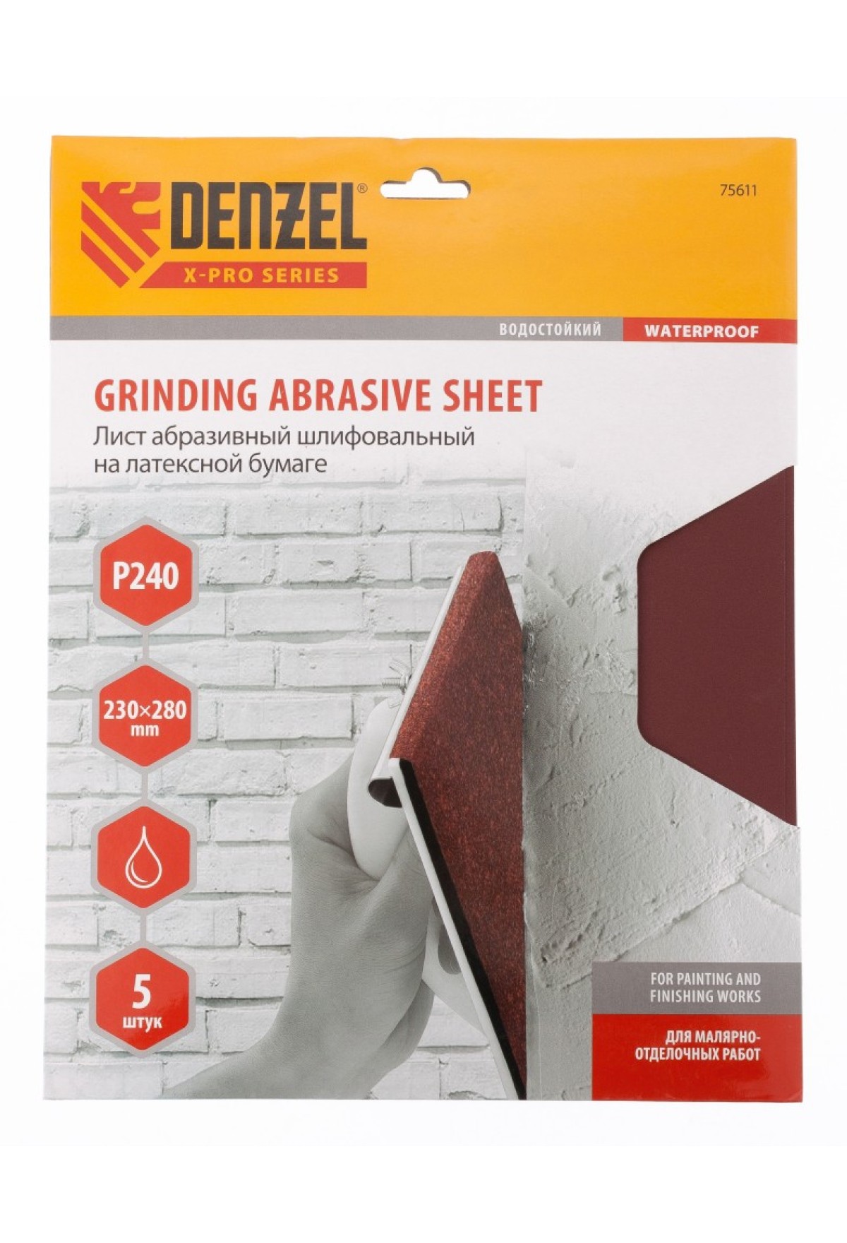 Шлифлист на бумажной основе, P 240, 230 х 280 мм, 5 шт, латексный, водостойкий Denzel