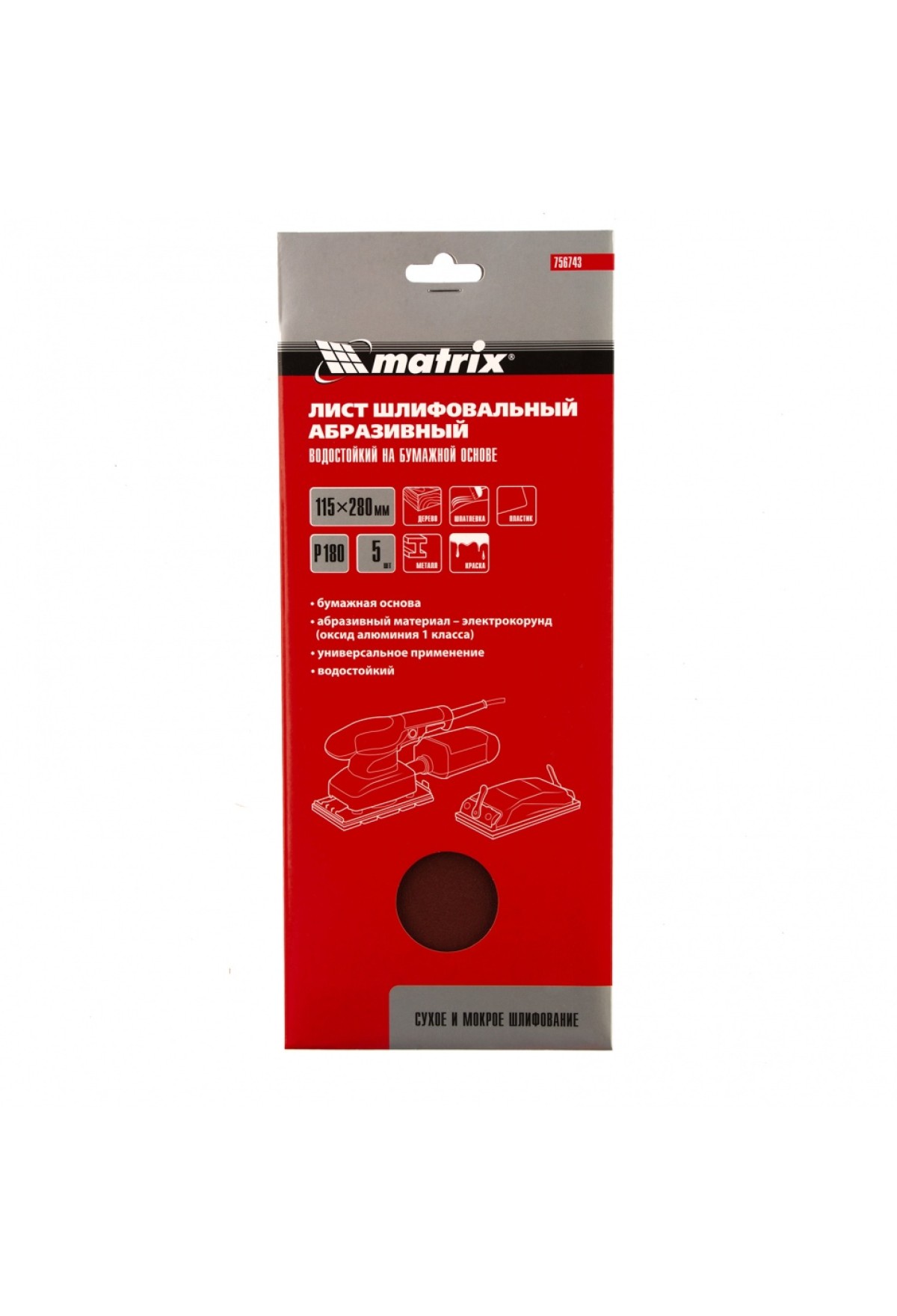 Шлифлист на бумажной основе, P 180, 115 х 280 мм, 5 шт, водостойкий Matrix