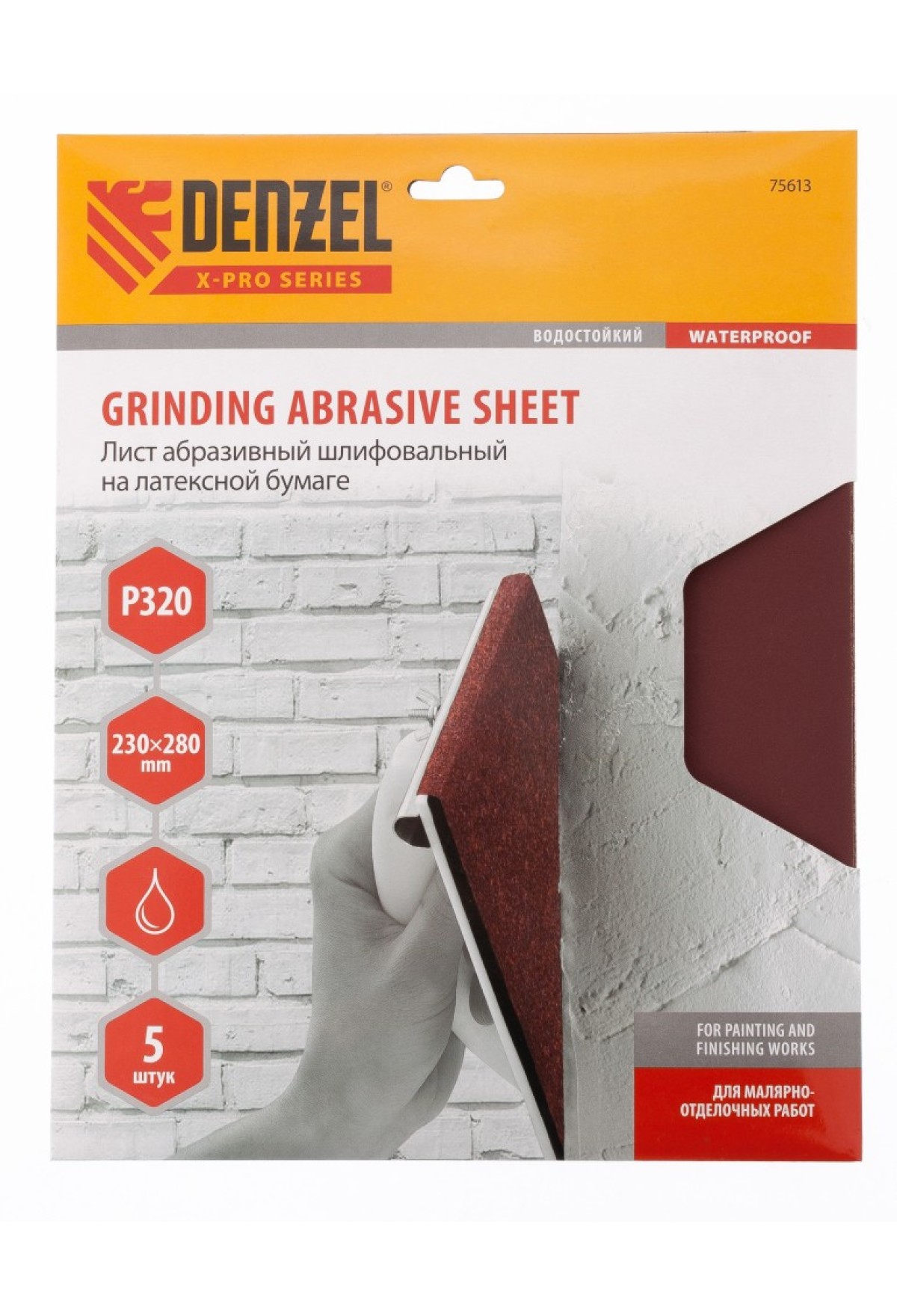Шлифлист на бумажной основе, P 320, 230 х 280 мм, 5 шт, латексный, водостойкий Denzel