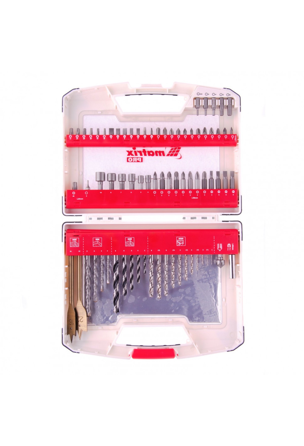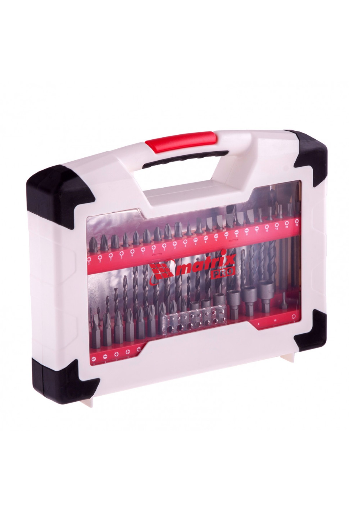 Комбинированный набор Matrix PRO 725675 — универсальное решение для мастеров, т. к. он содержит 75 предметов: калибровочную шкалу, отверточные биты (44 шт.) и адаптер к ним, зенковку, 6 торцевых головок, 2 перовых сверла, сверла по дереву 3-8 мм, сверла по бетону 4-8 мм и сверла по металлу 1-6 мм. Оснастка подходит как для бытового использования, так и решения профессиональных задач.