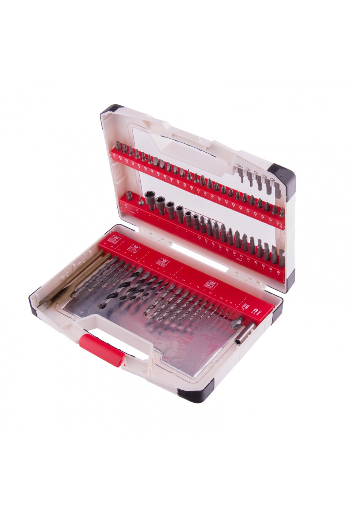 | Комплектация | Сверло по металлу 1, 1,5, 2, 2,5, 3, 3,5, 4, 4,2, 4,5, 5, 5,5, 6 - 12 штСверло по бетону 4, 5, 6, 8 - 4 штСверло по дереву 3, 4, 5, 6, 8 - 5 штБита 25 мм PH0, PH1, PH2, PH3, PZ0, PZ1, PZ2, PZ3, SL3, SL4, SL5, SL6, SL7, H2, H2,5, H3, H4, H5, H6, TORX10, TORX15, TORX20, TORX25, TORX27, TORX30, TORX40 - 44 штГоловка торцевая 4, 5, 6, 7, 8, 10 - 6 штСверло перовое по дереву 16, 22 - 2 штЗенковка по металлу - 1 штАдаптер для бит с магнитом - 1 штКалибр - 1 штПластиковый кейс - 1 шт |
