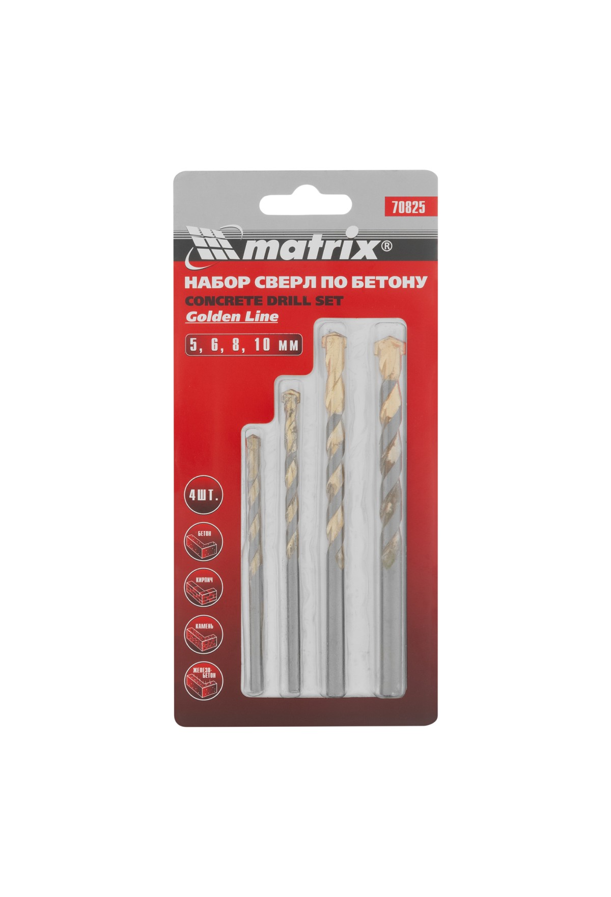 Набор сверл по бетону Matrix Golden Line 70825 предназначен для получения отверстий диаметром 5, 6, 8, 10 мм в твердых материалах: бетоне, кирпиче, камне, железобетоне. Благодаря агрессивной форме заточки их можно использовать в режиме ударного сверления.