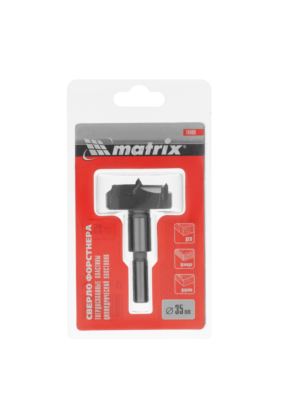 Сверло Форстнера Matrix 70490 диаметром 35 мм, с твердосплавной пластиной и цилиндрическим хвостовиком, используется в мебельной промышленности. Позволяет получать глухие отверстия большого диаметра, с ровными краями и дном. Сверло применяется также во время установки замков, дверных петель и т. д. Оснастка рассчитана на сверление древесины любой твердости, фанеры, ДСП и других материалов.