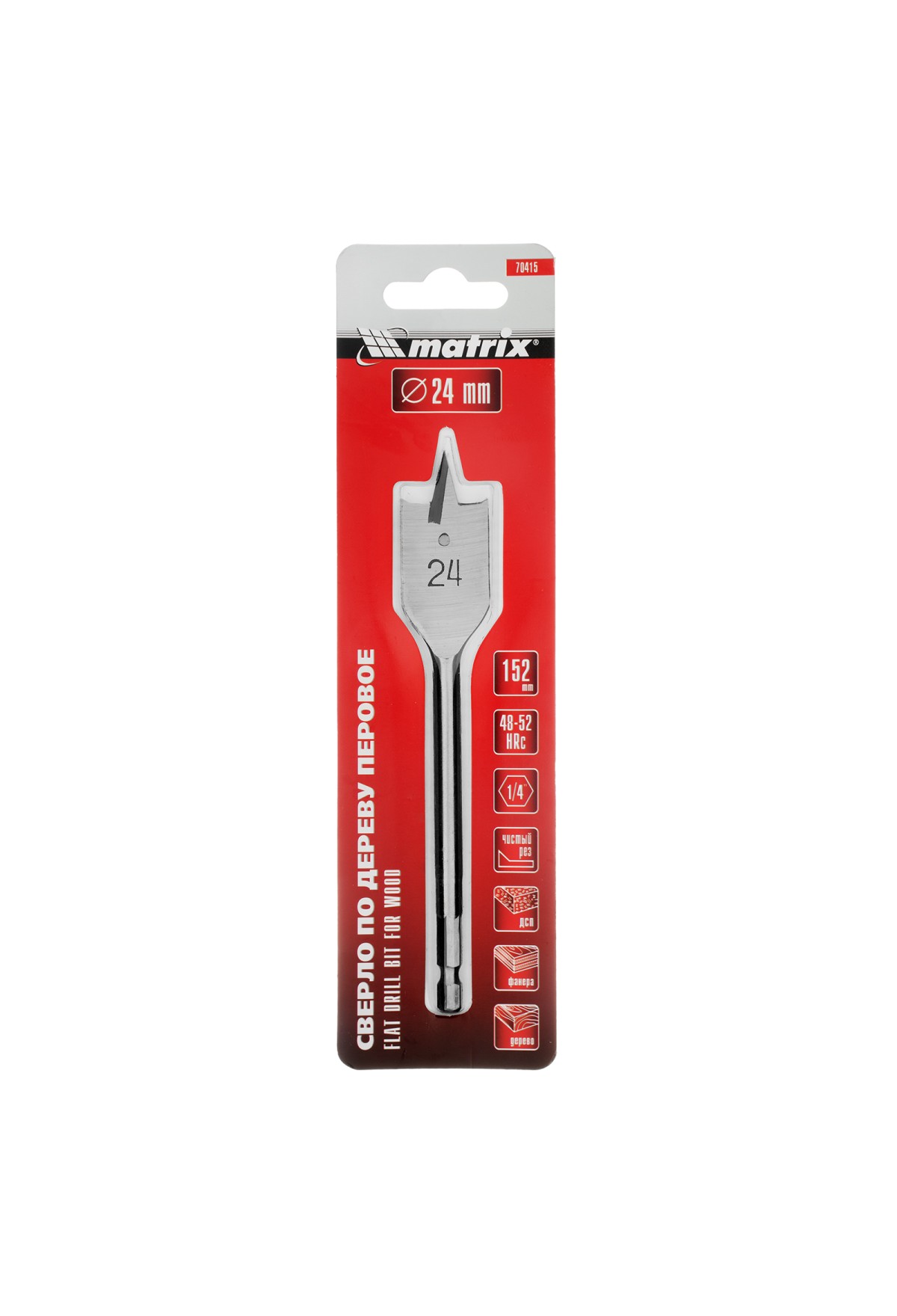 Перовое сверло по дереву Matrix 70415 диаметром 24 мм, с 6-гранным хвостовиком, имеет рабочую часть в виде «лопатки» с режущими кромками по бокам, поэтому эффективно для сверления глубоких сквозных и глухих отверстий. Оснастка устанавливается на ручную механическую или электрическую дрель, сверлильный станок, с ее помощью можно сверлить древесину любых пород.