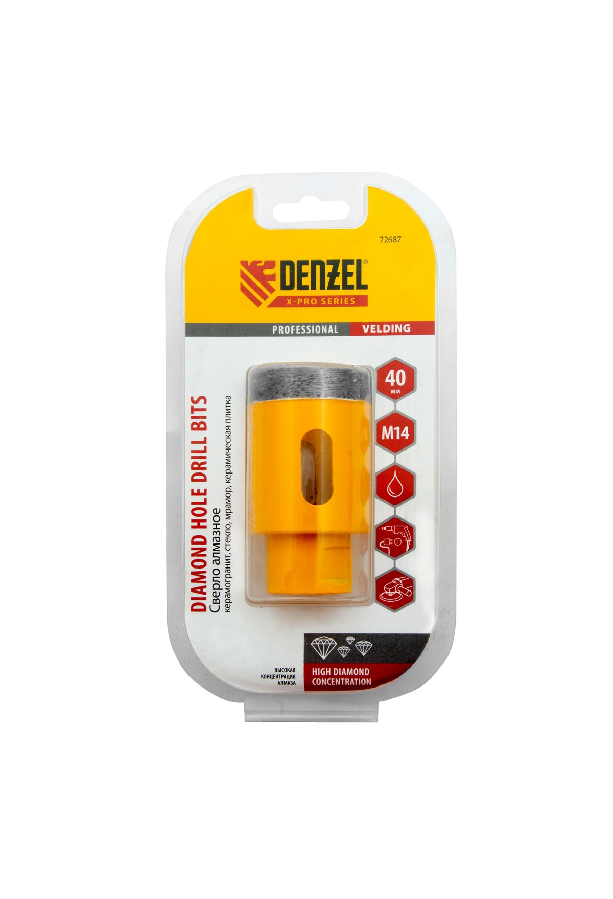 Алмазное сверло Denzel 72687 диаметром 40 мм, с резьбой М14, предназначено для «мокрого» сверления по керамограниту, мрамору, стеклу и керамической плитке. Позволяет получать ровные отверстия без сколов, используется для проведения ремонтных и отделочных работ. Сверло (коронку) устанавливают на вал углошлифовальной машины, благодаря чему скорость сверления увеличивается в несколько раз по сравнению с дрелью или шуруповертом. Применение водяного охлаждения повышает срок службы оснастки. Чтобы точно позиционировать сверло при сверлении дрелью, рекомендуется использовать кондуктор (арт. 72830).