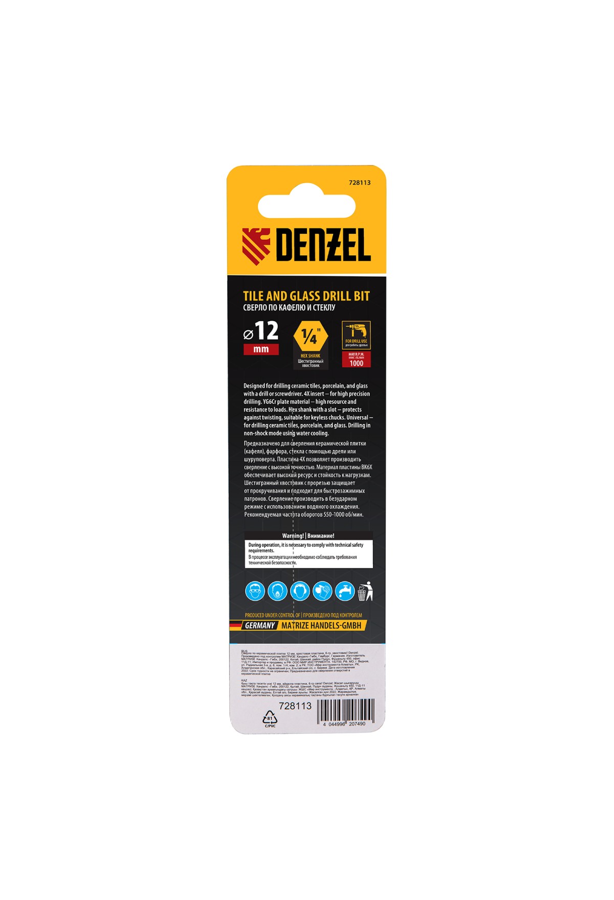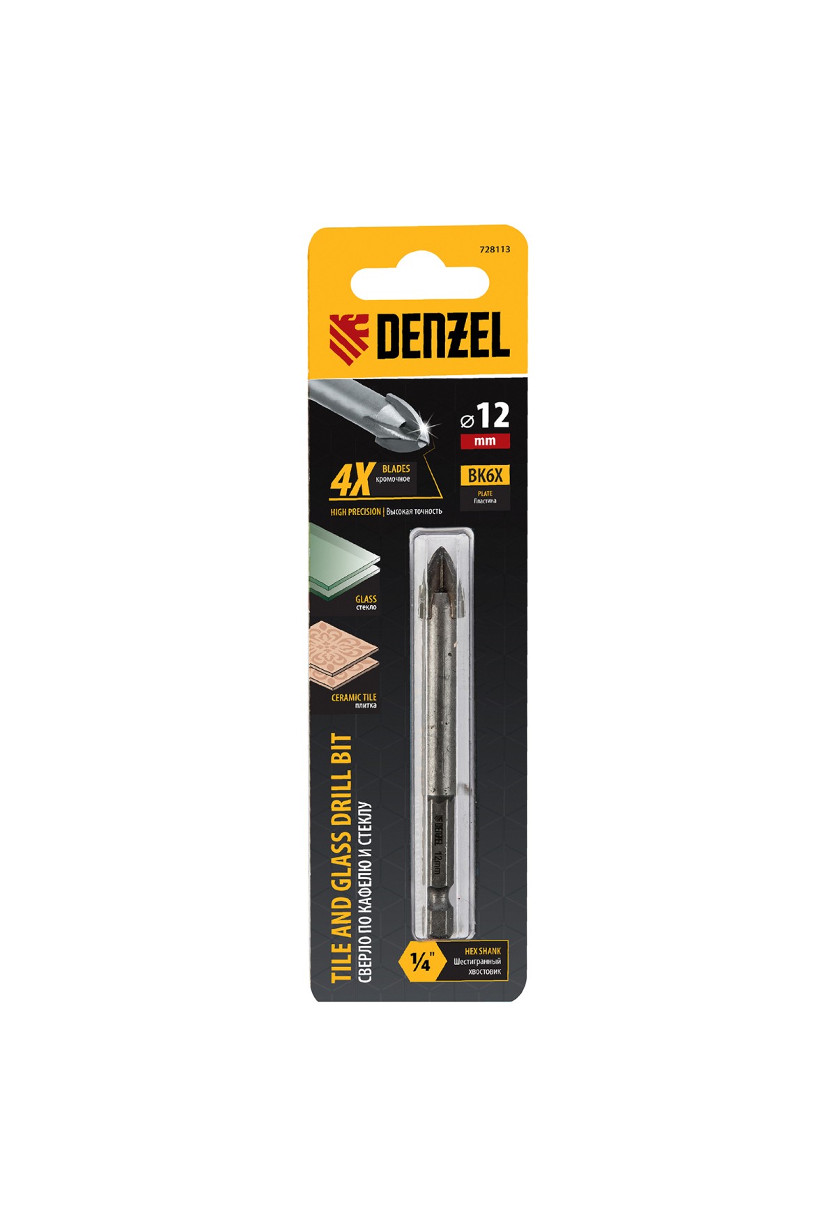 Сверло Denzel 728113, 12 мм, с крестовой пластинкой и шестигранным хвостовиком, рассчитано на сверление керамической плитки, стекла, мрамора и фарфора. Благодаря 4-гранной режущей пластине оно обеспечивает высокую скорость засверливания. Сверло подходит для интенсивного профессионального использования. В процессе работы рекомендуется применять водяное охлаждение для увеличения ресурса сверла.