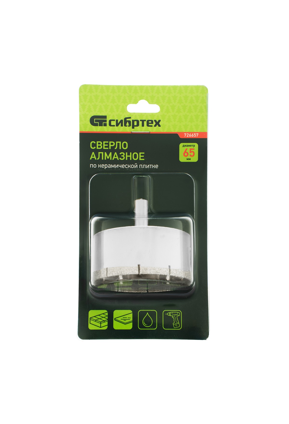 Сверло Сибртех 726657 размером 65 х 55 мм, с цилиндрическим хвостовиком, используется для получения ровных отверстий без сколов в стекле и керамической плитке. Устанавливается в патрон дрели или шуруповерта, работающих в диапазоне 350-700 об/мин. Во время работы рекомендуется применять водяное охлаждение — это существенно увеличит ресурс оснастки. Использование кондуктора (арт. 72830) позволяет точно позиционировать сверло и облегчает засверливание. Оснастка подходит для выполнения работ небольшого объема и рекомендована для использования в быту.