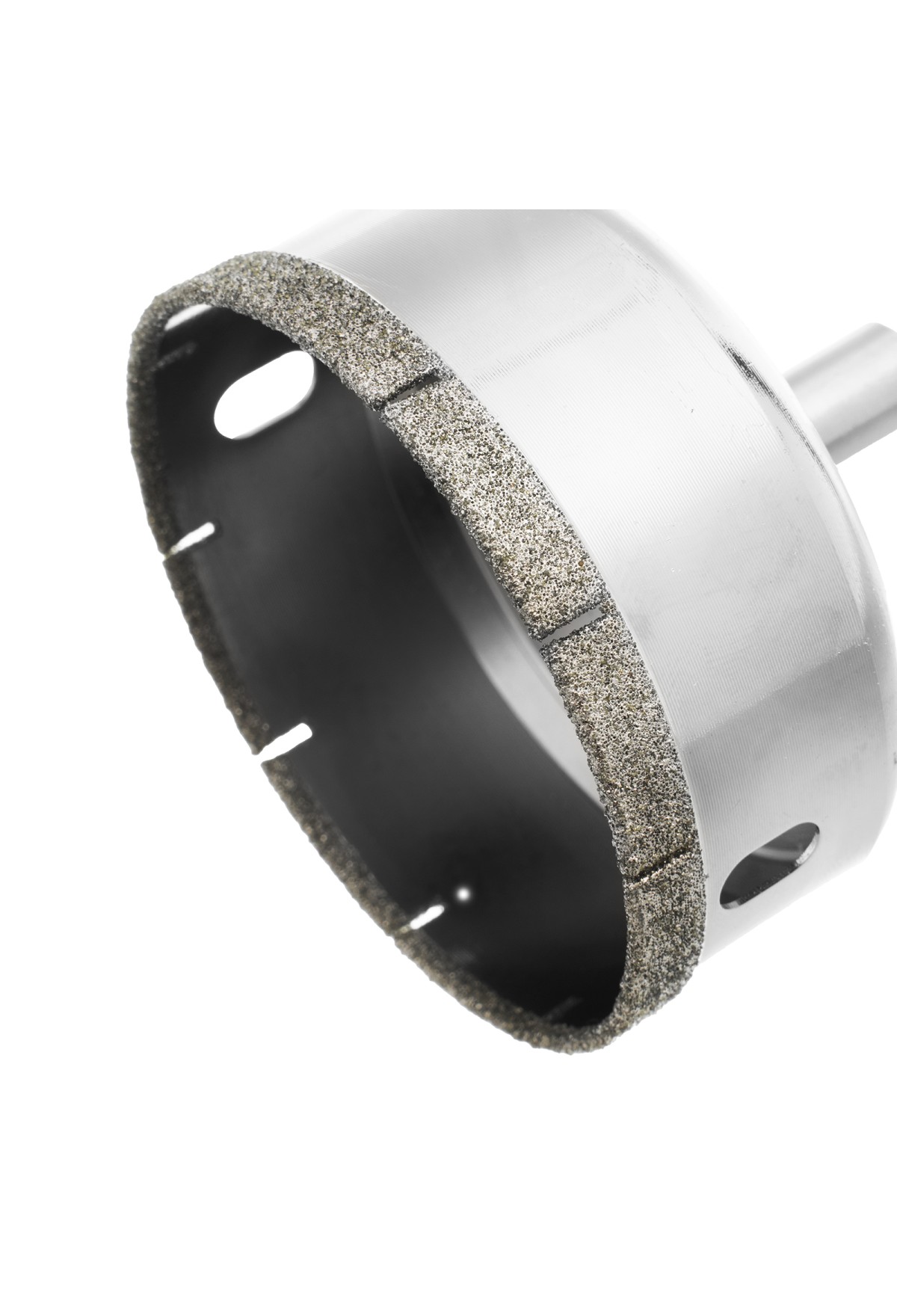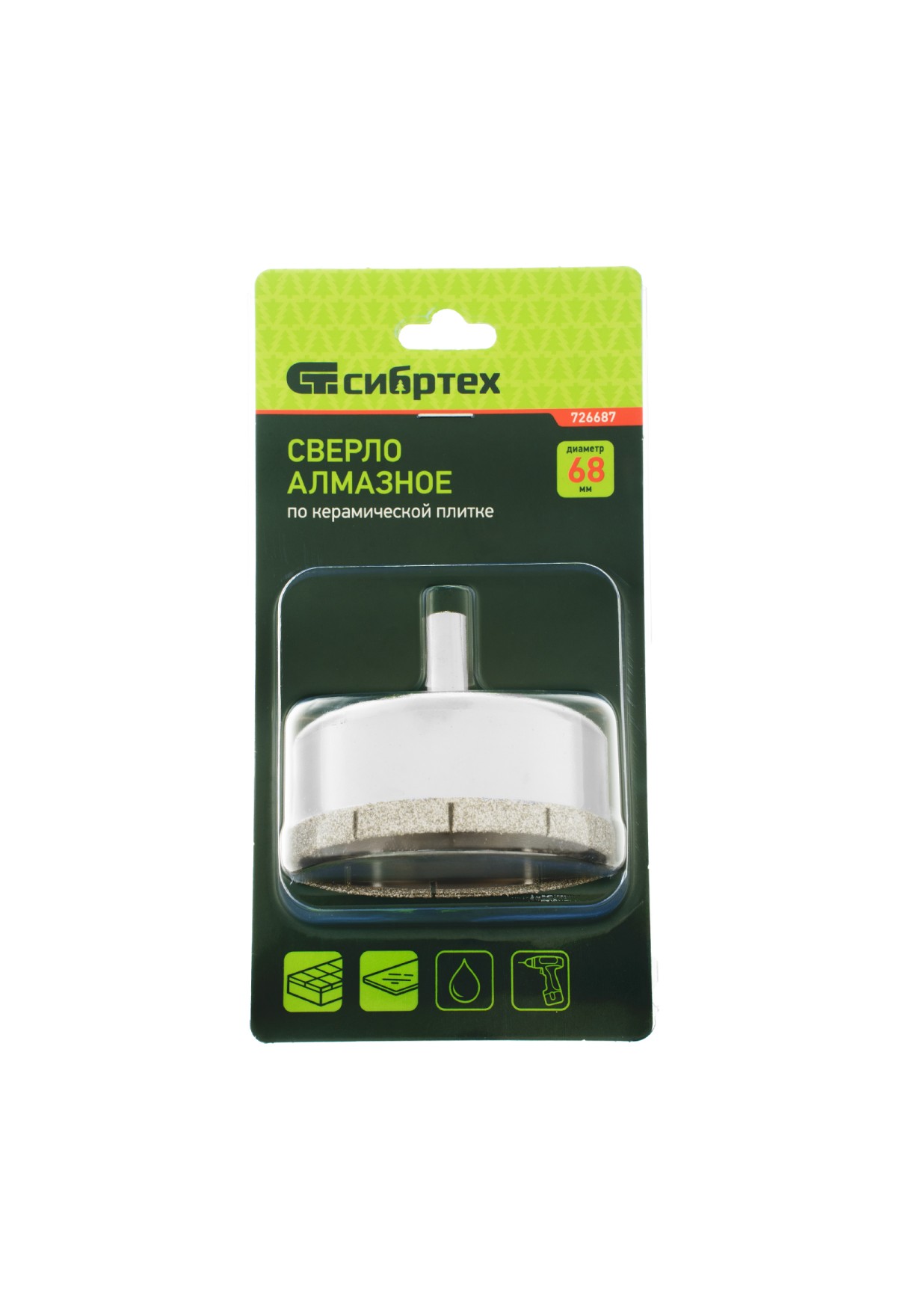 Сверло Сибртех 726687 размером 68 х 55 мм, с цилиндрическим хвостовиком, используется для получения ровных отверстий без сколов в стекле и керамической плитке. Устанавливается в патрон дрели или шуруповерта, работающих в диапазоне 350-700 об/мин. Во время работы рекомендуется применять водяное охлаждение — это существенно увеличит ресурс оснастки. Использование кондуктора (арт. 72830) позволяет точно позиционировать сверло и облегчает засверливание. Оснастка подходит для выполнения работ небольшого объема и рекомендована для использования в быту.