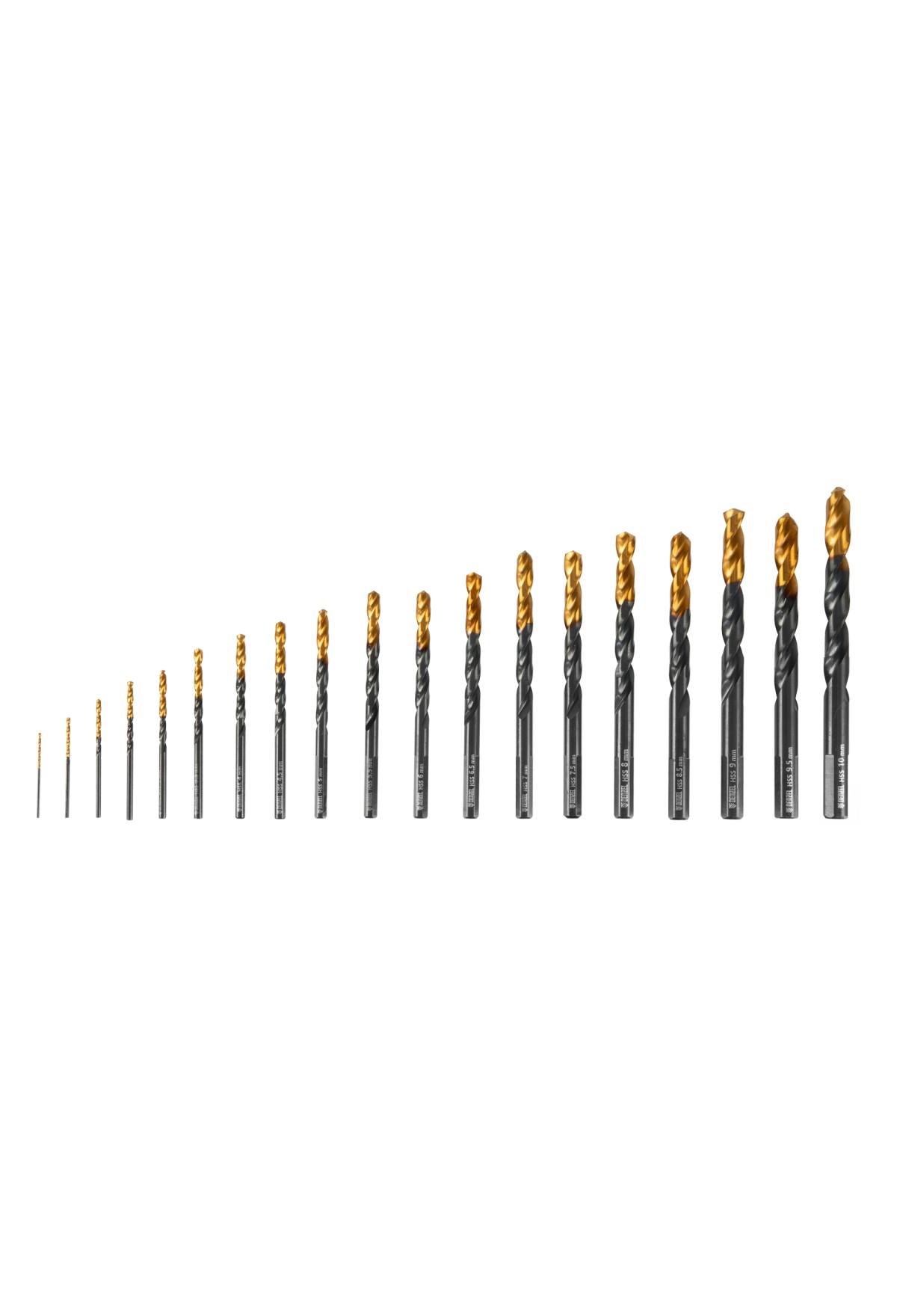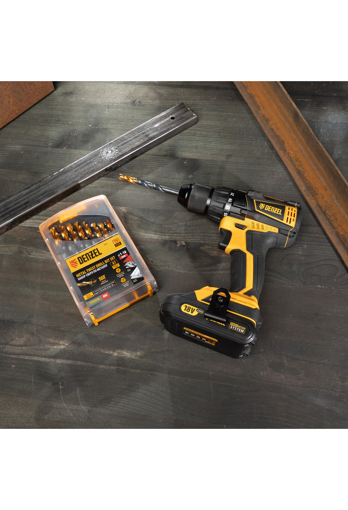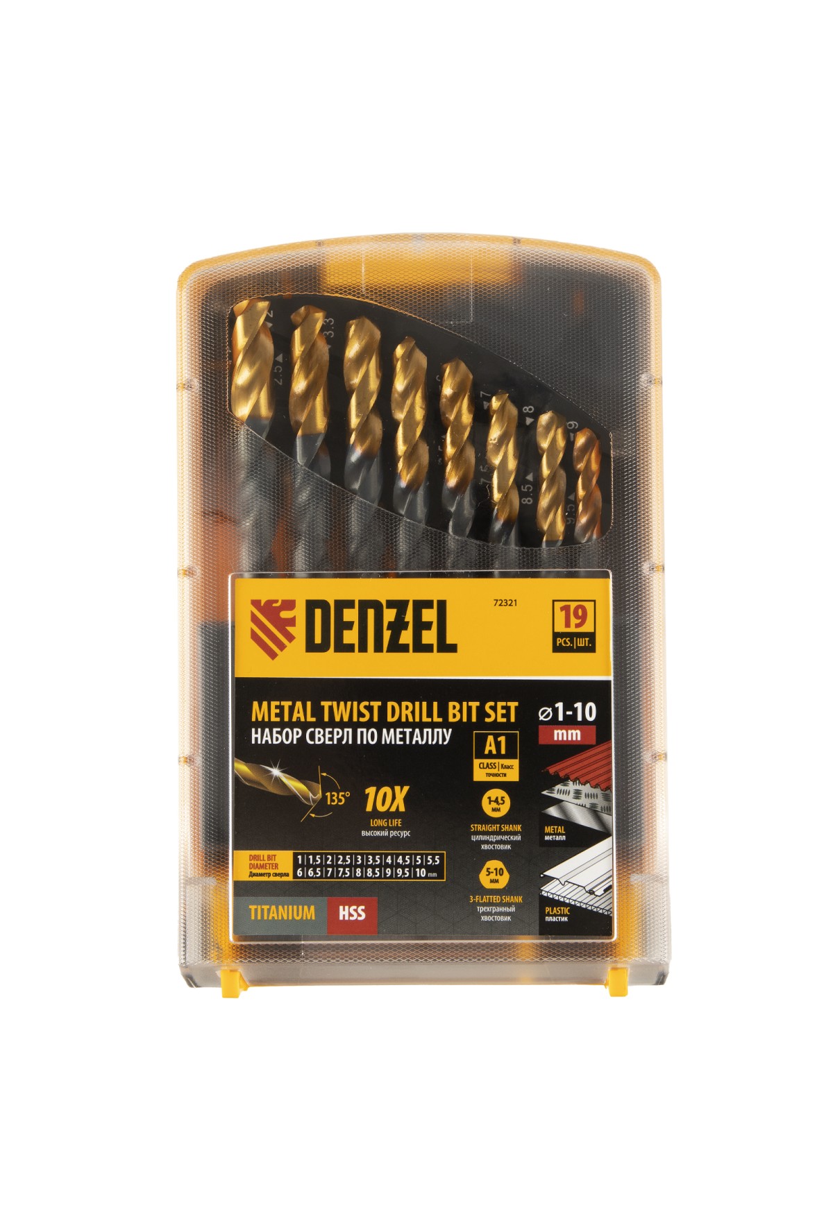 На складе Код товара: VR6-723003 Набор сверл по металлу, 1-10 мм, Р6М5-TiN, Golden Tip, 19 шт Denzel