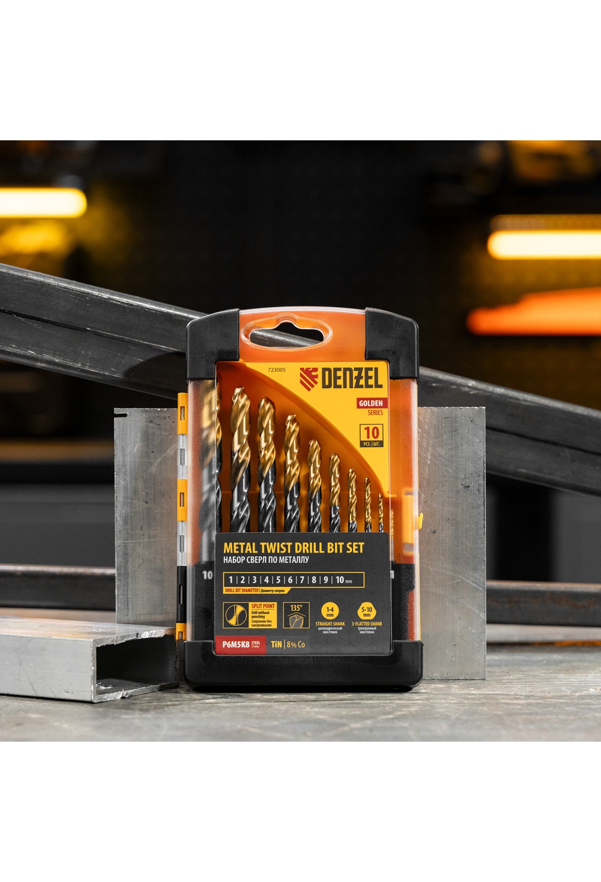 Набор Denzel Golden Tip 723005 состоит из 10 сверл по металлу диаметром 1-10 мм, изготовленных из стали P6M5K8. Угол заточки составляет 135°, что позволяет получать чистые и ровные отверстия в закаленной и нержавеющей стали, цветных и черных металлах, а также жестком пластике. Сверлам присвоен класс точности A1, что гарантирует высокое качество выполняемых работ. Оснастка характеризуется пониженным коэффициентом трения, что облегчает сверление и улучшает отвод стружки. Набор будет полезен дома и в мастерской.