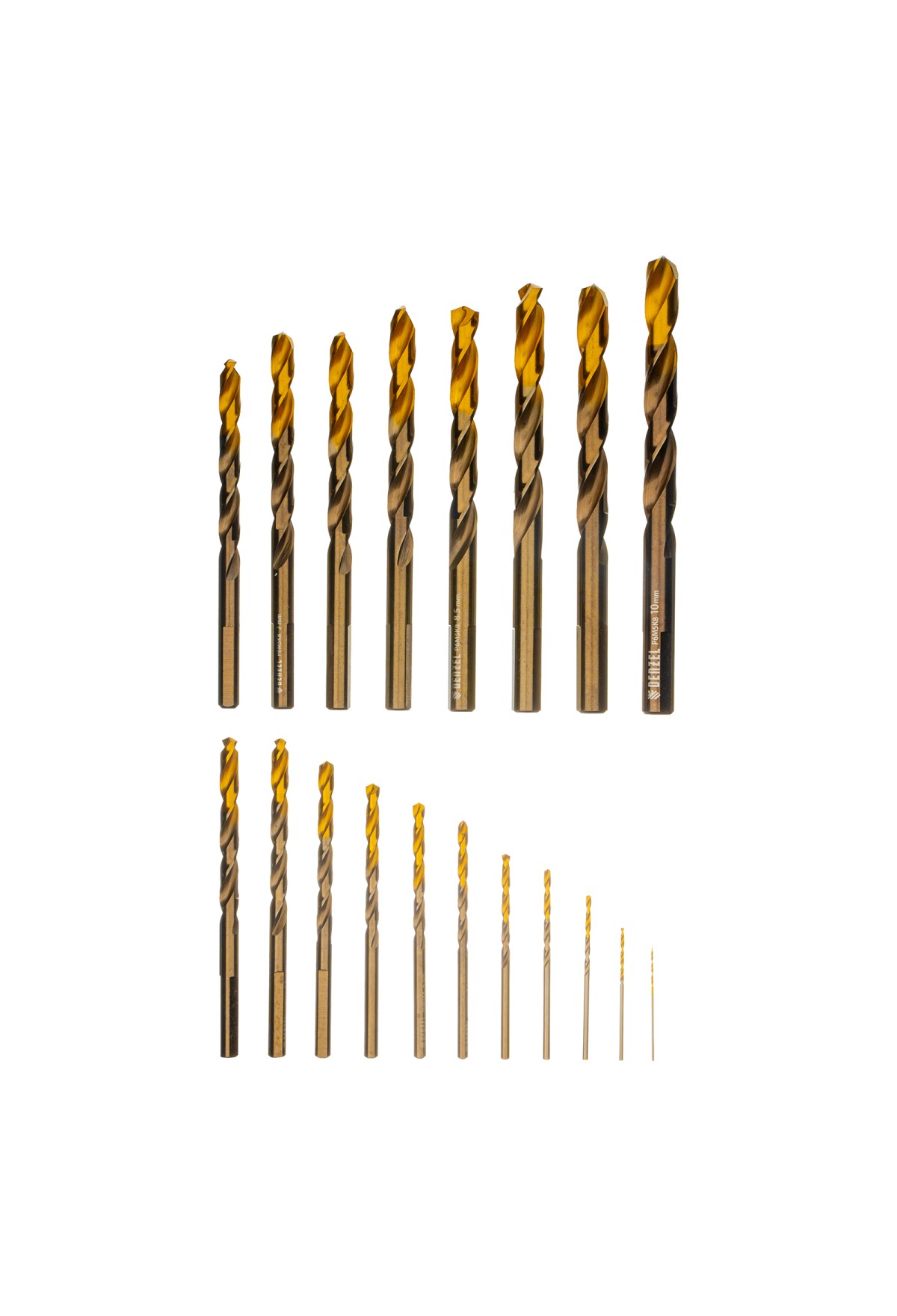 Набор Denzel Golden Tip 723008 состоит из 19 сверл по металлу диаметром 1-10 мм, изготовленных из стали P6M5K8. Угол заточки составляет 135°, что позволяет получать чистые и ровные отверстия в закаленной и нержавеющей стали, цветных и черных металлах, а также жестком пластике. Сверлам присвоен класс точности A1, что гарантирует высокое качество выполняемых работ. Оснастка характеризуется пониженным коэффициентом трения, что облегчает сверление и улучшает отвод стружки. Набор будет полезен дома и в мастерской.