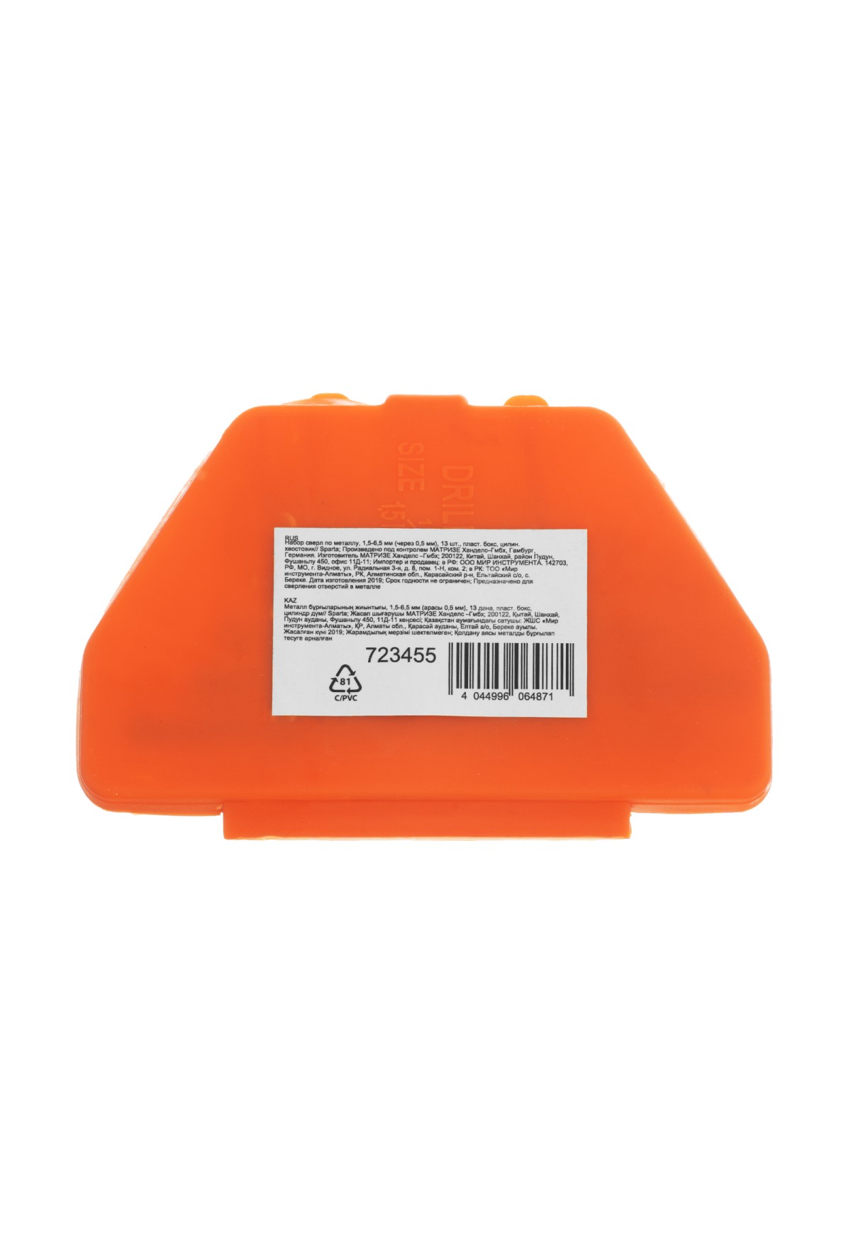 | Комплектация | Сверло по металлу 1,5,2,2,5,3,3,2,3,5,4,4,5,4,8,5,5,5,6,6,5 мм - 13 шт |