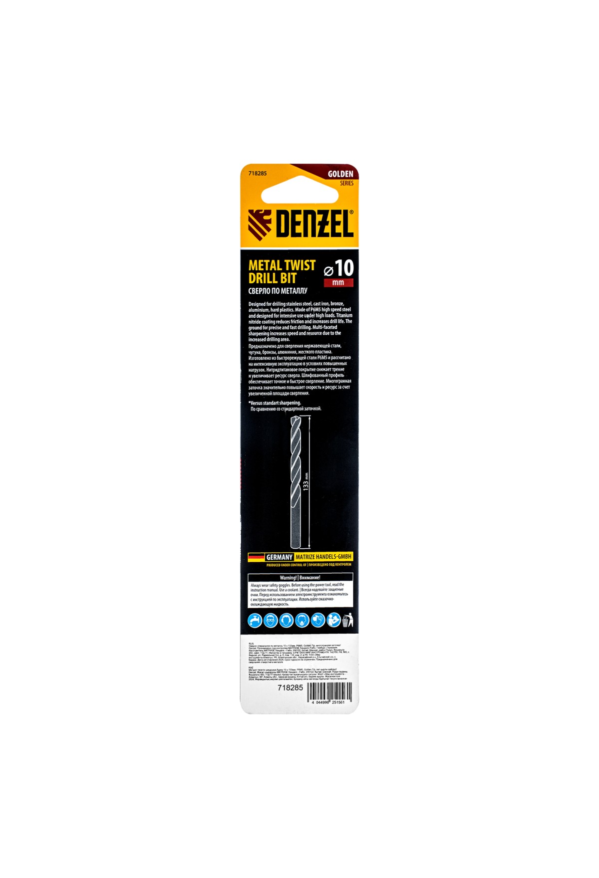Технические характеристики Сверло спиральное по металлу 10 x 133мм, Р6М5, Golden Tip, многогранная заточка Denzel