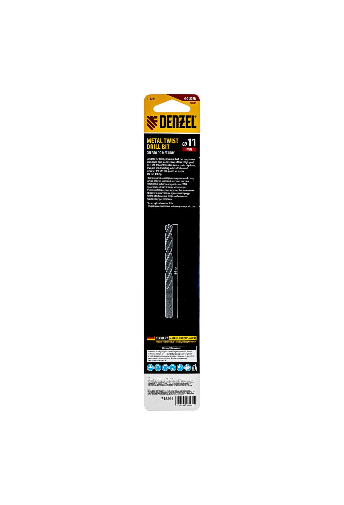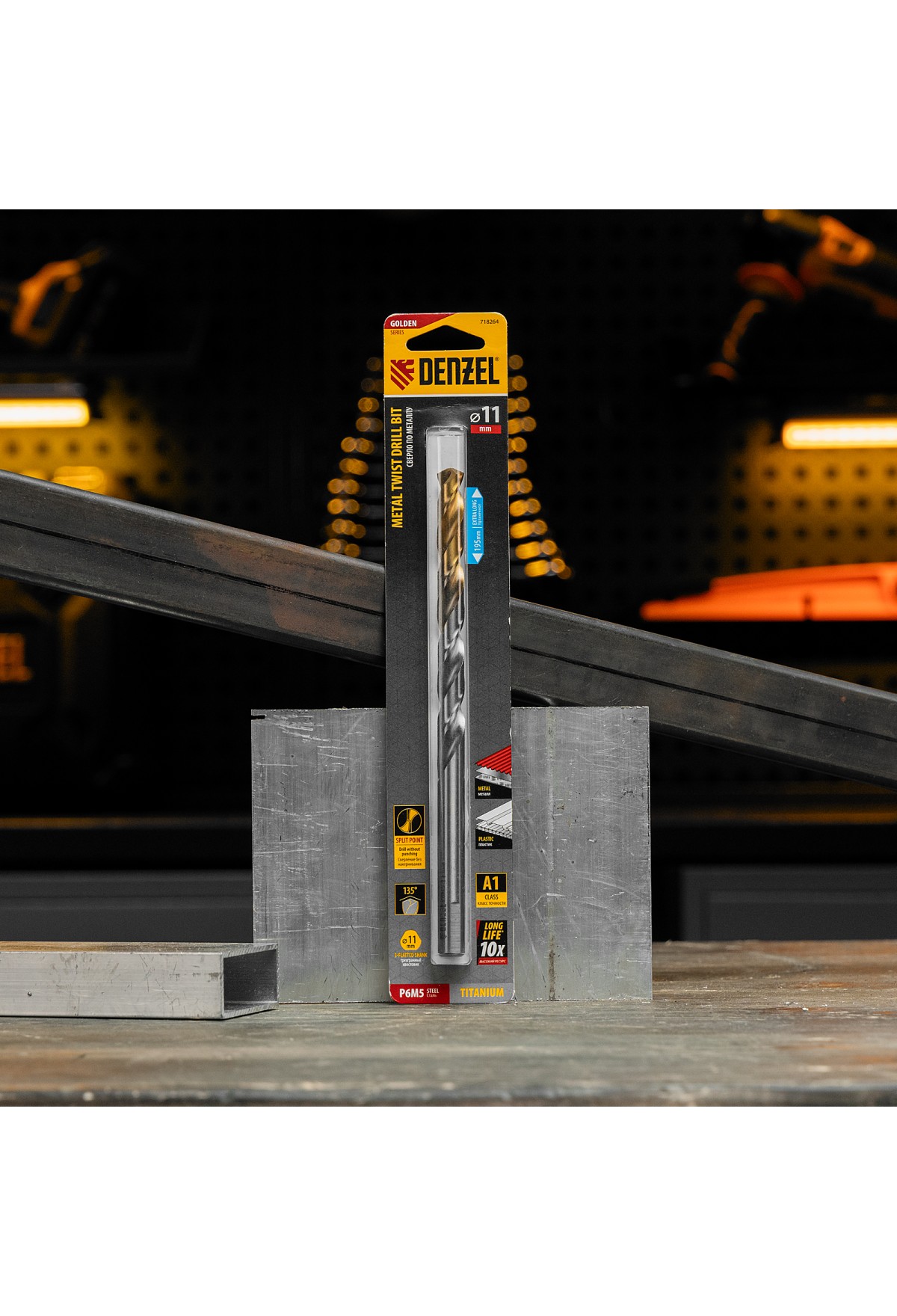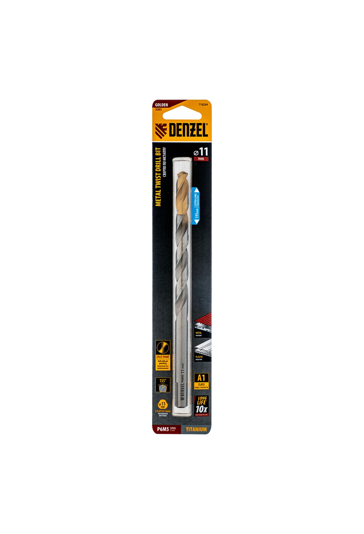 Удлиненное спиральное сверло по металлу Denzel Golden Tip 718264 из стали P6M5, размером 11 х 195 мм, предназначено для получения отверстий в легированных и цветных металлах — меди, алюминии, мягкой бронзе, титане, латуни. Оснастка позволяет эффективно справляться с этими задачами благодаря оптимальному углу заточки 135°. Класс точности A гарантирует высокое качество работ, а удлиненный профиль позволяет сверлить глубокие отверстия. Сверло используется для проведения монтажно-сборочных работ.