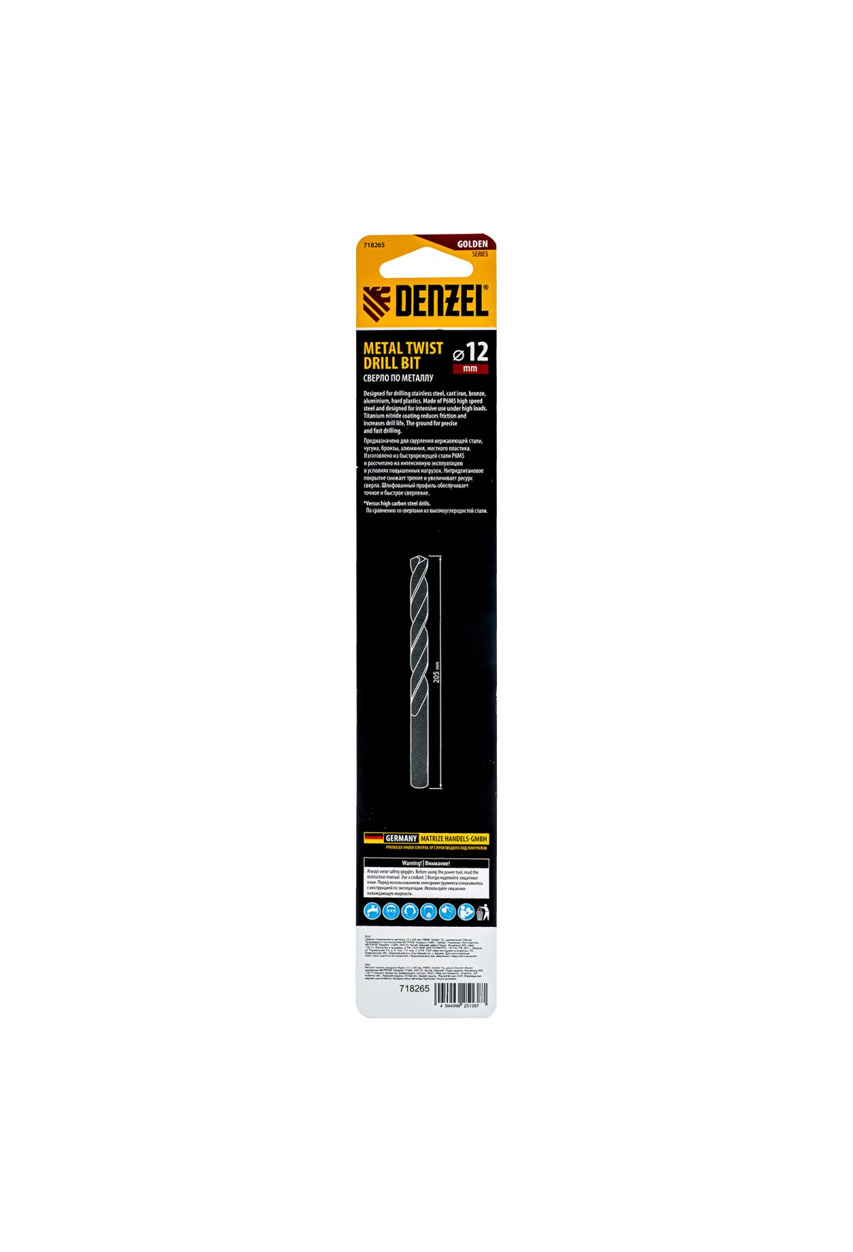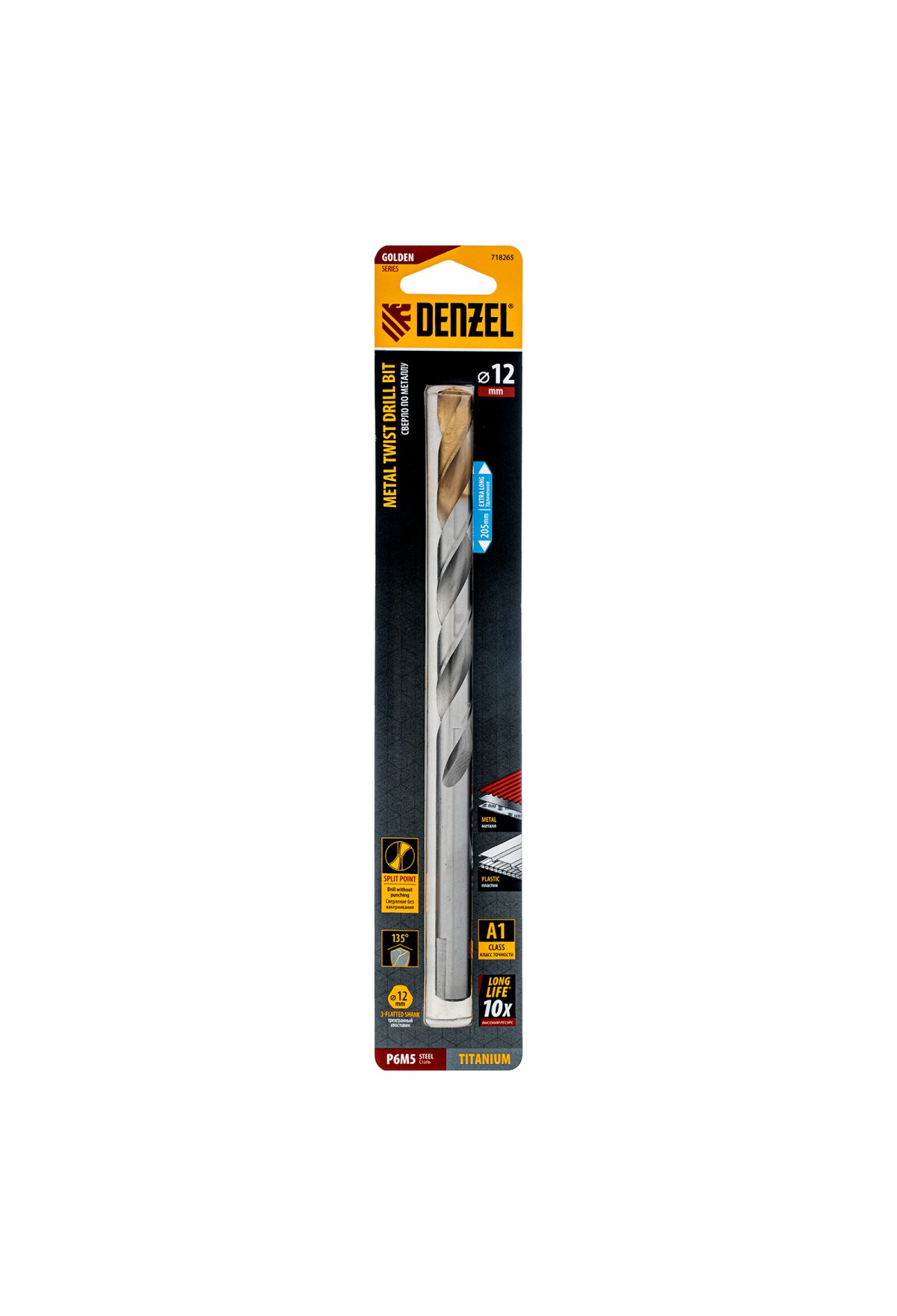 Удлиненное спиральное сверло по металлу Denzel Golden Tip 718265 из стали P6M5, размером 12 х 205 мм, предназначено для получения отверстий в легированных и цветных металлах — меди, алюминии, мягкой бронзе, титане, латуни. Оснастка позволяет эффективно справляться с этими задачами благодаря оптимальному углу заточки 135°. Класс точности A гарантирует высокое качество работ, а удлиненный профиль позволяет сверлить глубокие отверстия. Сверло используется для проведения монтажно-сборочных работ.