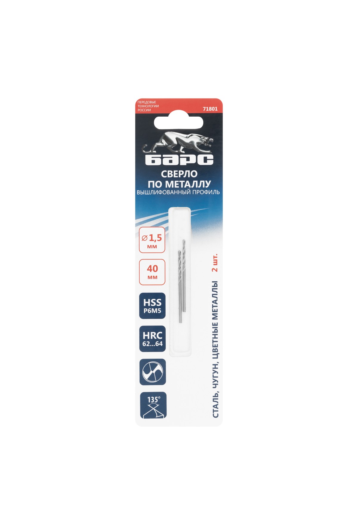 Спиральное сверло по металлу Барс 71801 из стали P6M5, диаметром 1,5 мм и длиной 40 мм, 2 шт. в упаковке, имеет угол заточки 135° и используется для получения отверстий в легированных и цветных металлах: алюминии, мягкой бронзе, титане, меди, латуни. Имеет класс точности A, что обеспечивает высокое качество проводимых работ. Сверло из высококачественной быстрорежущей стали твердостью 58-62 HRC устойчиво к перегреву и динамическим нагрузкам. Пригодится для выполнения монтажно-сборочных работ.