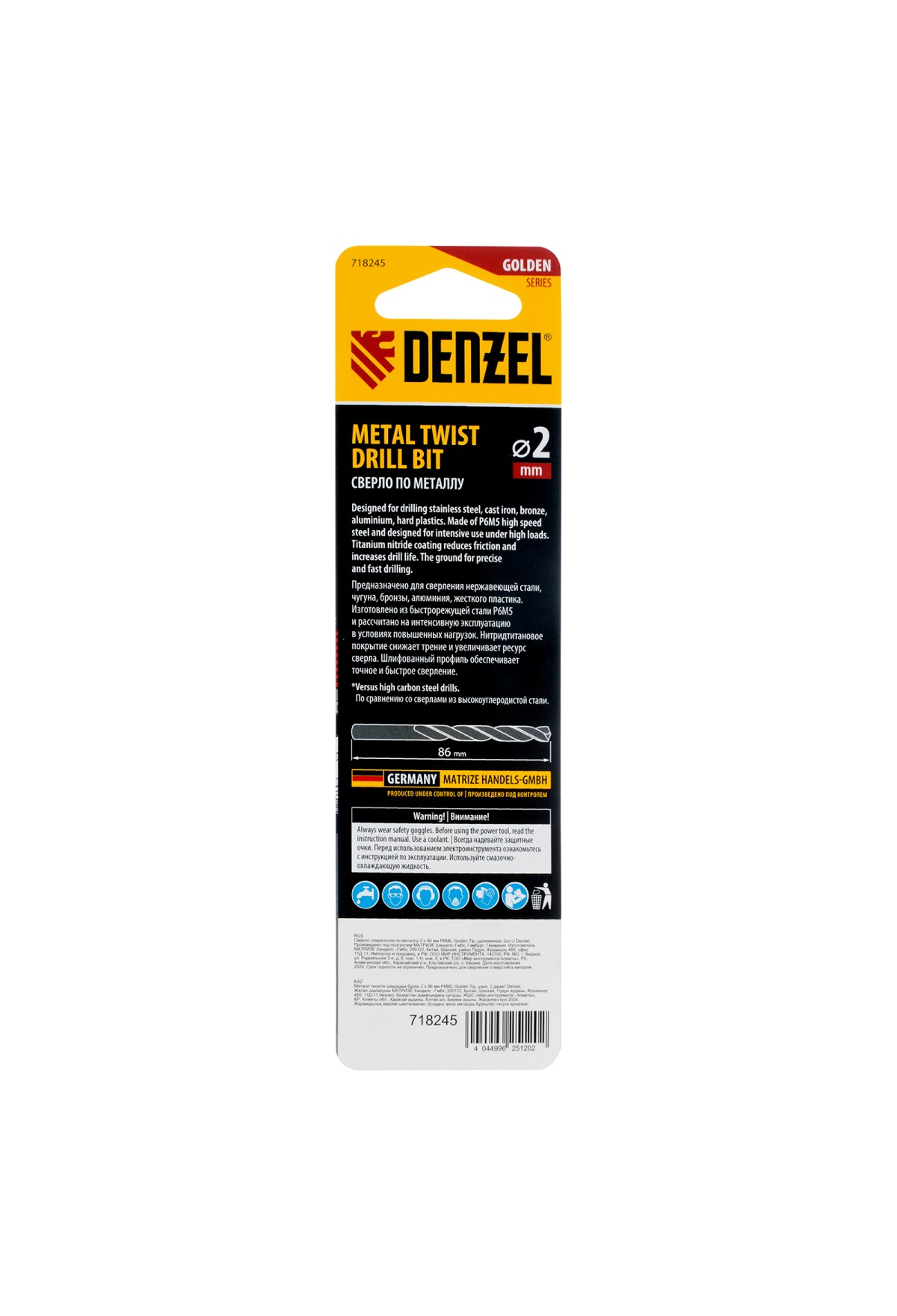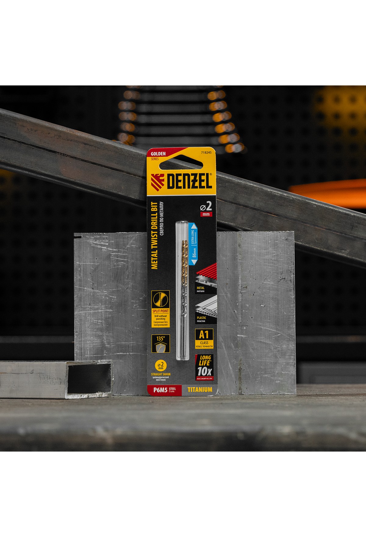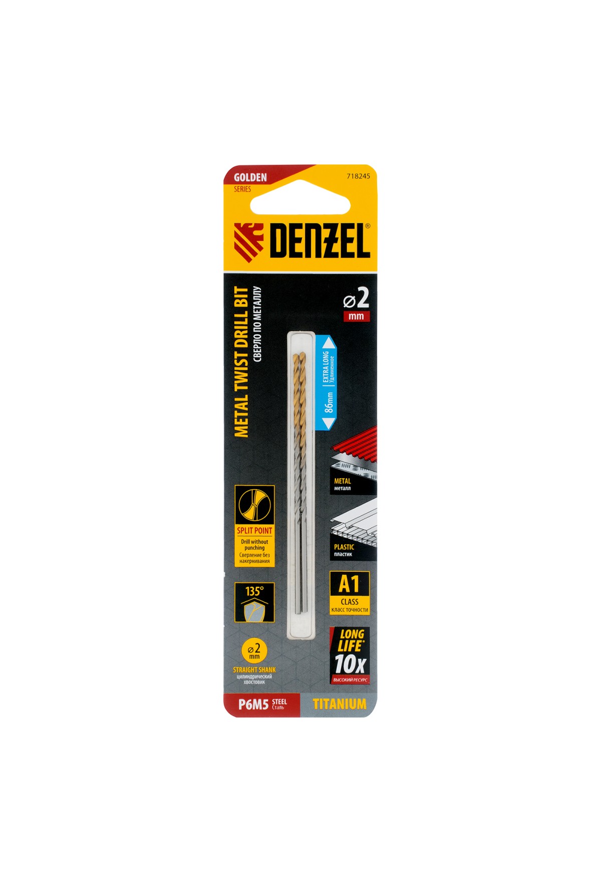 Удлиненное спиральное сверло по металлу Denzel Golden Tip 718245 из стали P6M5, размером 2 х 86 мм, 2 шт. в упаковке, предназначено для получения отверстий в легированных и цветных металлах — меди, алюминии, мягкой бронзе, титане, латуни. Оснастка позволяет эффективно справляться с этими задачами благодаря оптимальному углу заточки 135°. Класс точности A гарантирует высокое качество работ, а удлиненный профиль позволяет сверлить глубокие отверстия. Сверло используется для проведения монтажно-сборочных работ.