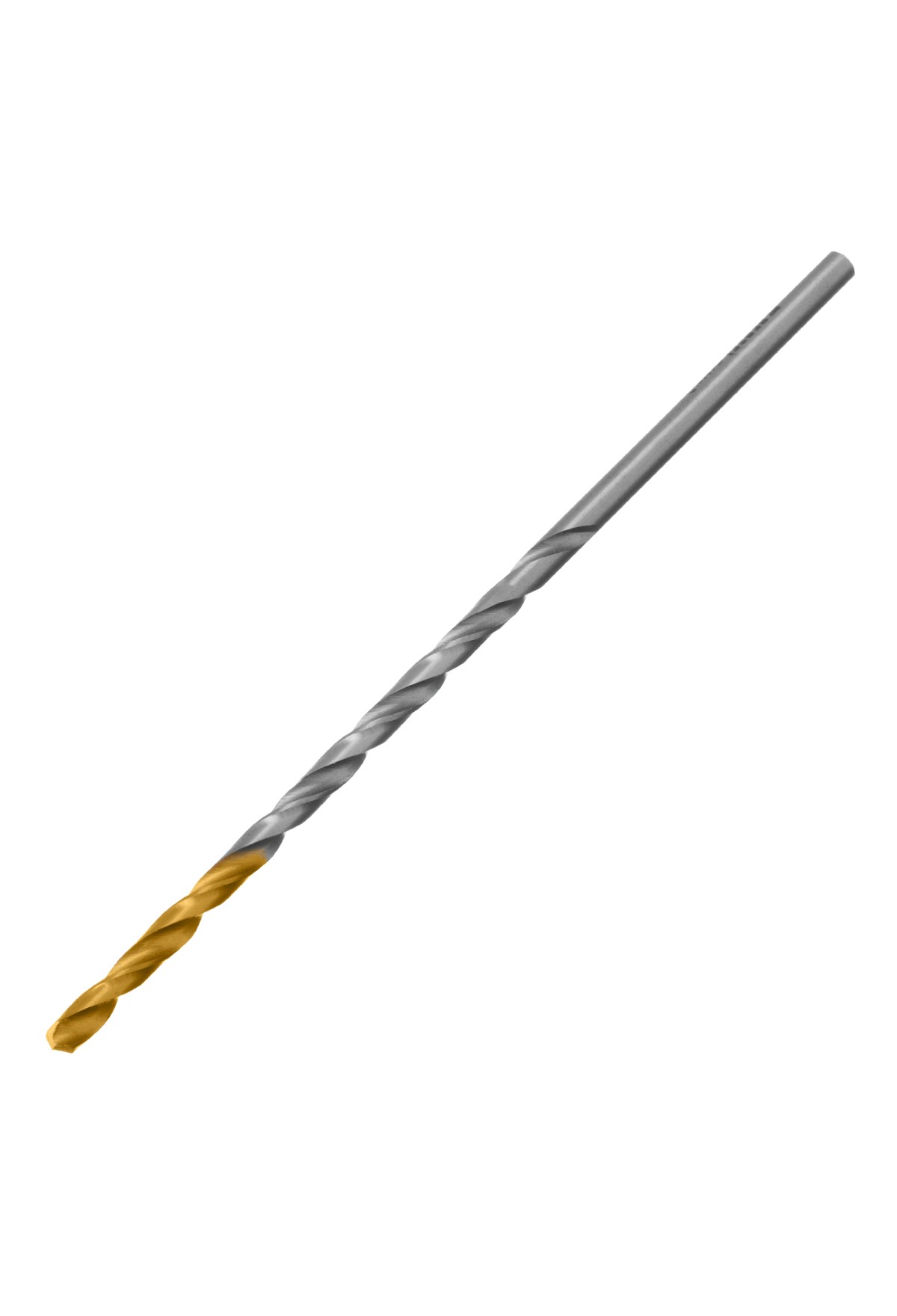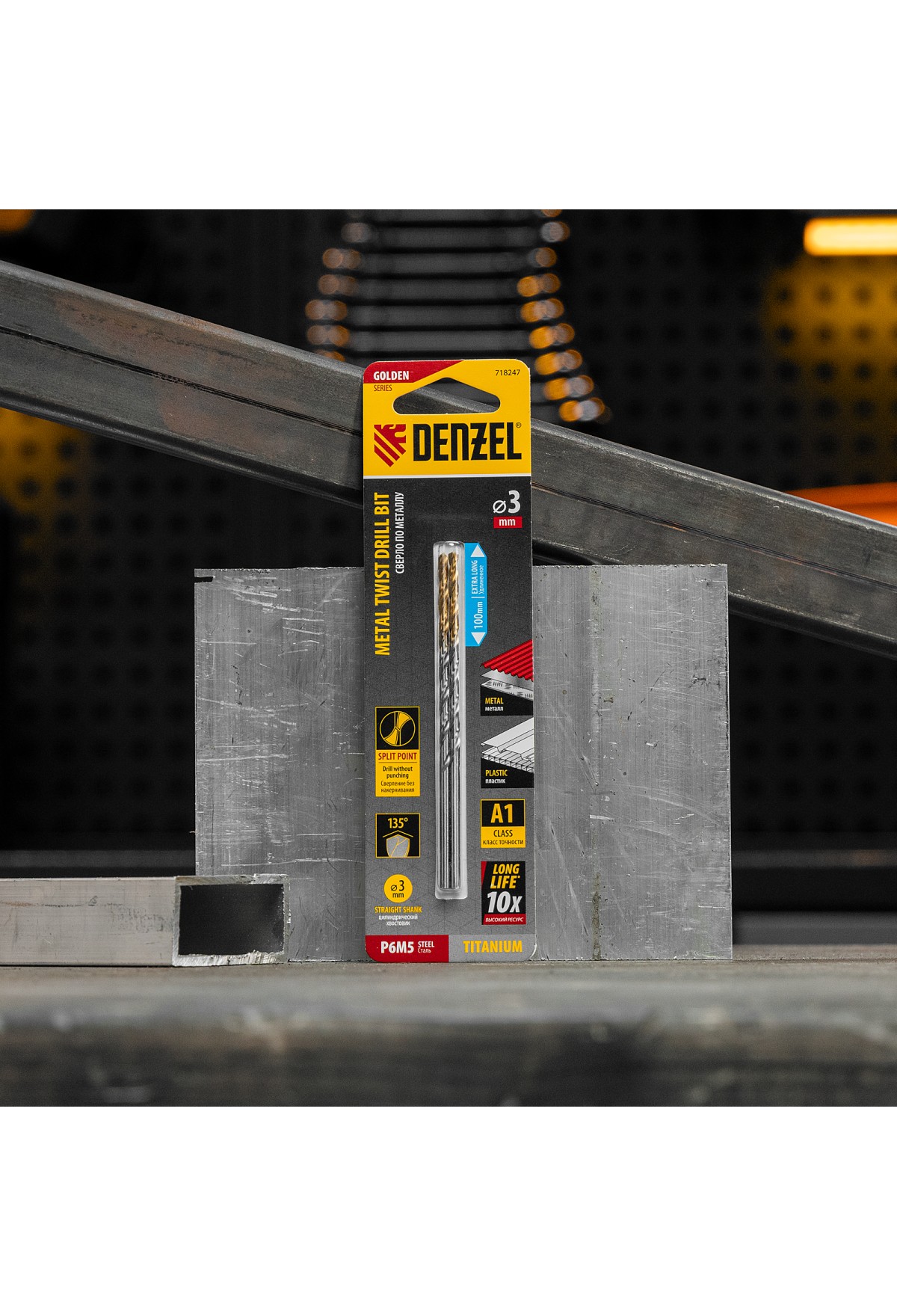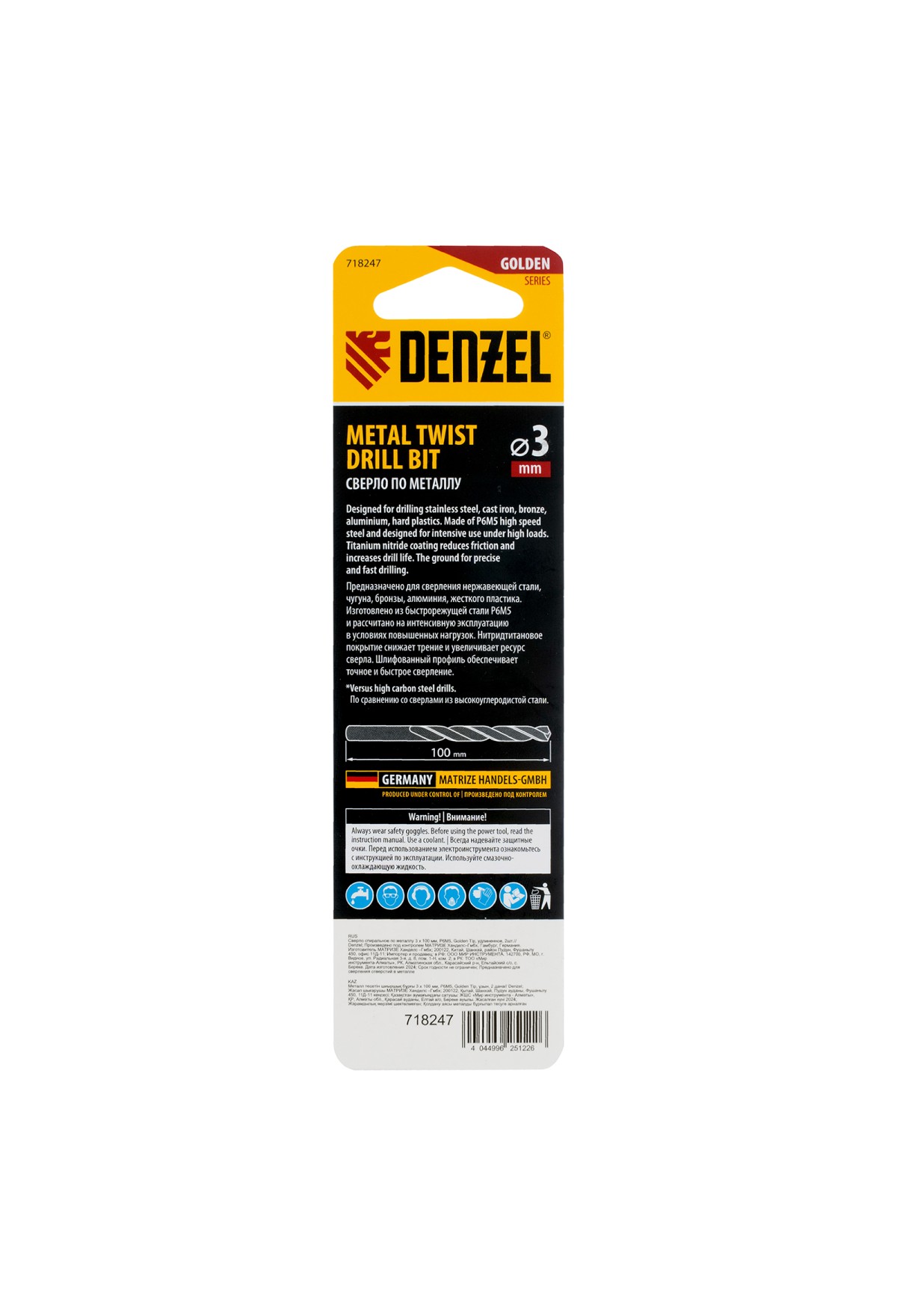 Удлиненное спиральное сверло по металлу Denzel Golden Tip 718247 из стали P6M5, размером 3 х 100 мм, 2 шт. в упаковке, предназначено для получения отверстий в легированных и цветных металлах — меди, алюминии, мягкой бронзе, титане, латуни. Оснастка позволяет эффективно справляться с этими задачами благодаря оптимальному углу заточки 135°. Класс точности A гарантирует высокое качество работ, а удлиненный профиль позволяет сверлить глубокие отверстия. Сверло используется для проведения монтажно-сборочных работ.