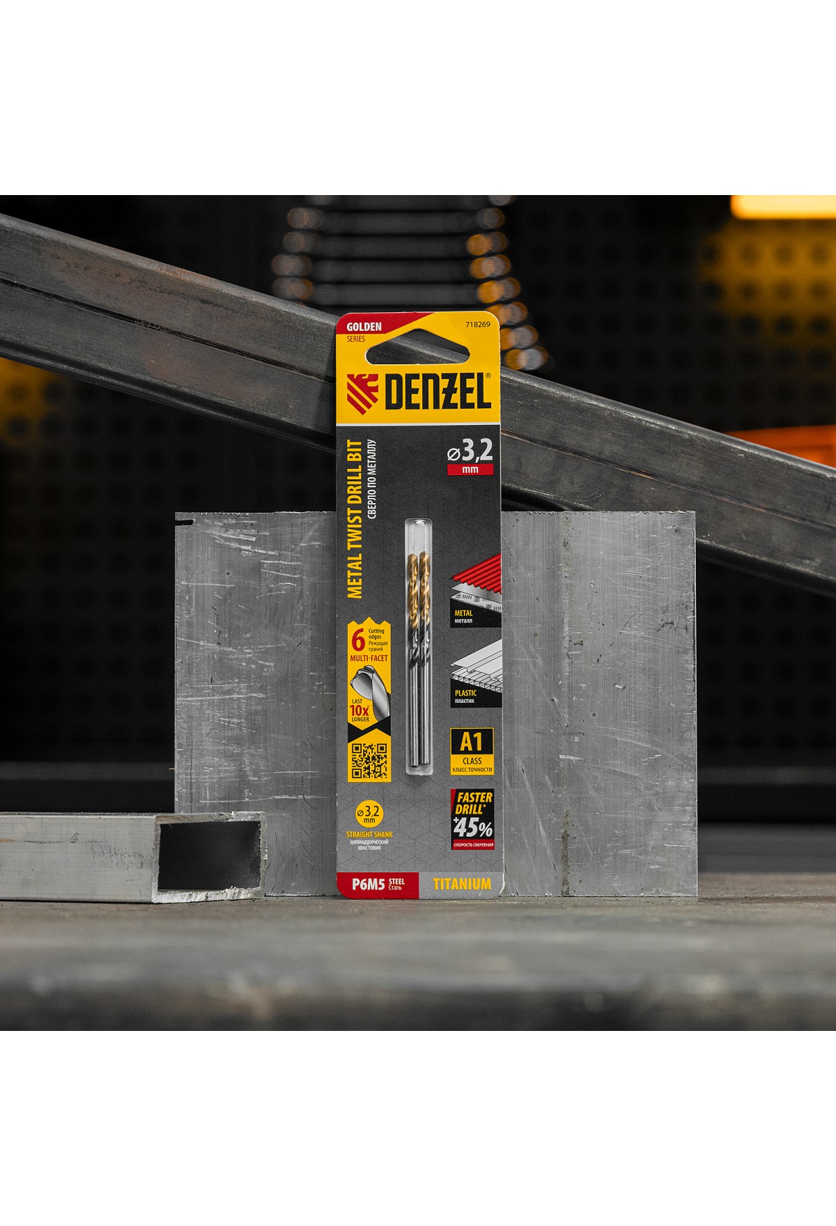 Спиральное сверло по металлу Denzel Golden Tip 718269 из стали P6M5, размером 3,2 х 65 мм, с многогранной заточкой, 2 штуки в упаковке, предназначено для получения отверстий в легированных сталях и цветных металлах. Многогранная заточка позволяет получать чистые и ровные отверстия практически без заусенцев. Сверлу присвоен класс точности A, что гарантирует высокое качество работ. Оснастка подходит для бытового и профессионального применения.