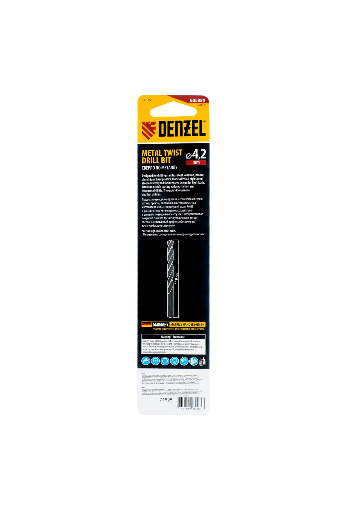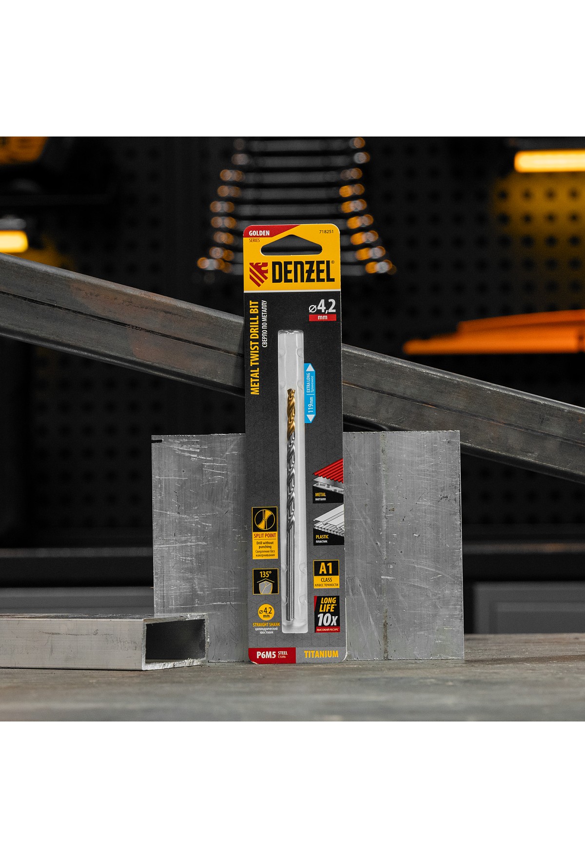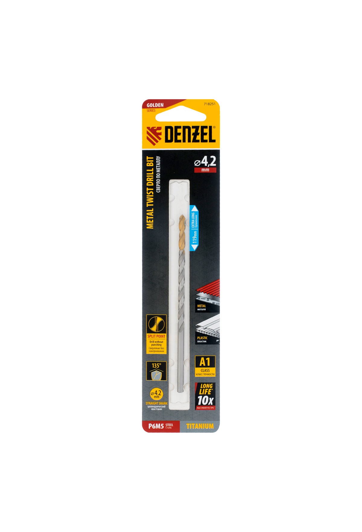 Удлиненное спиральное сверло по металлу Denzel Golden Tip 718251 из стали P6M5, размером 4,2 х 119 мм, предназначено для получения отверстий в легированных и цветных металлах — меди, алюминии, мягкой бронзе, титане, латуни. Оснастка позволяет эффективно справляться с этими задачами благодаря оптимальному углу заточки 135°. Класс точности A гарантирует высокое качество работ, а удлиненный профиль позволяет сверлить глубокие отверстия. Сверло используется для проведения монтажно-сборочных работ.