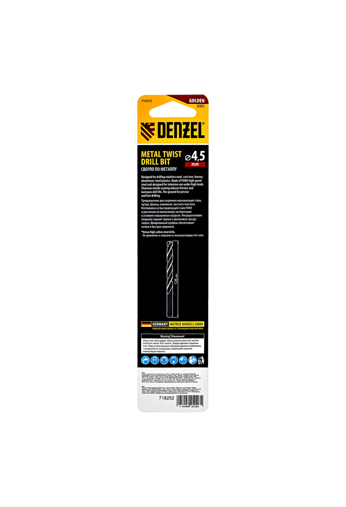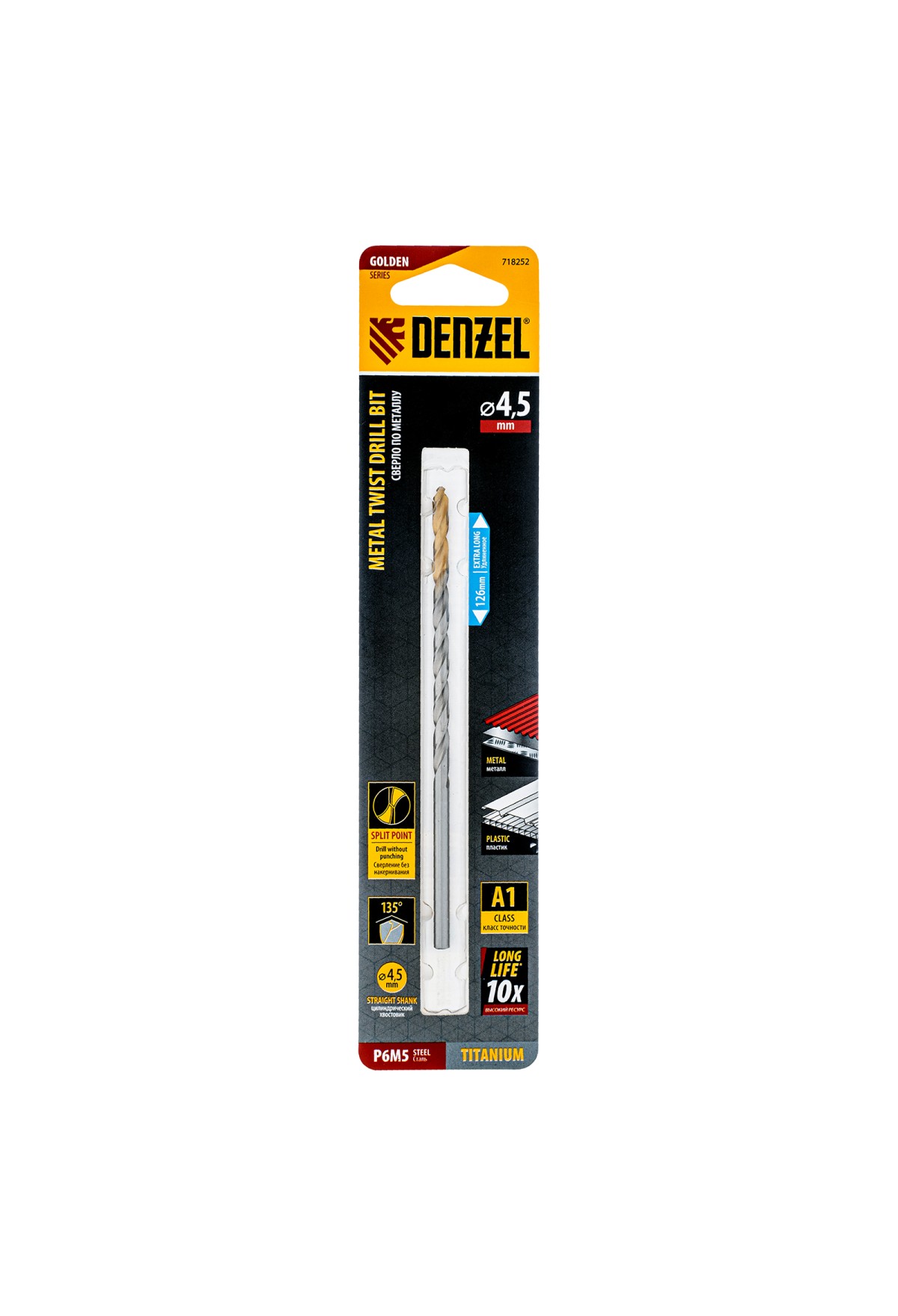 Технические характеристики Сверло спиральное по металлу 4,5 х 126 мм, Р6М5, Golden Tip, удлиненное Denzel