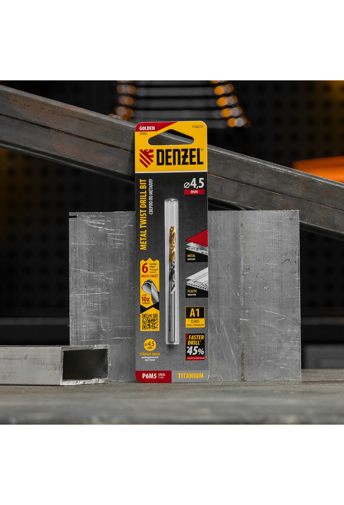 Спиральное сверло по металлу Denzel Golden Tip 718274 из стали P6M5, размером 4,5 х 80 мм, с многогранной заточкой, предназначено для получения отверстий в легированных сталях и цветных металлах. Многогранная заточка позволяет получать чистые и ровные отверстия практически без заусенцев. Сверлу присвоен класс точности A, что гарантирует высокое качество работ. Оснастка подходит для бытового и профессионального применения.