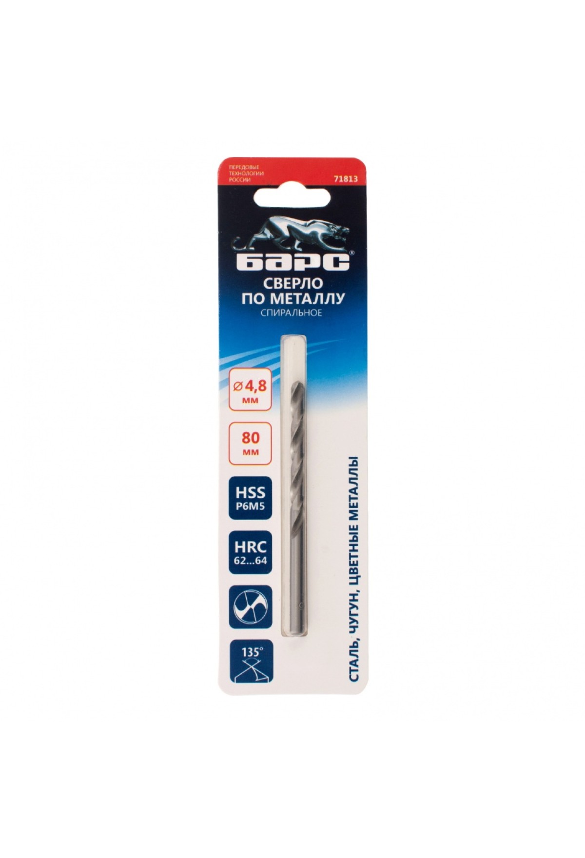 Спиральное сверло по металлу Барс 71813 из стали P6M5, диаметром 4,8 мм и длиной 80 мм, имеет угол заточки 135° и используется для получения отверстий в легированных и цветных металлах: алюминии, мягкой бронзе, титане, меди, латуни. Имеет класс точности A, что обеспечивает высокое качество проводимых работ. Сверло из высококачественной быстрорежущей стали твердостью 58-62 HRC устойчиво к перегреву и динамическим нагрузкам. Пригодится для выполнения монтажно-сборочных работ.