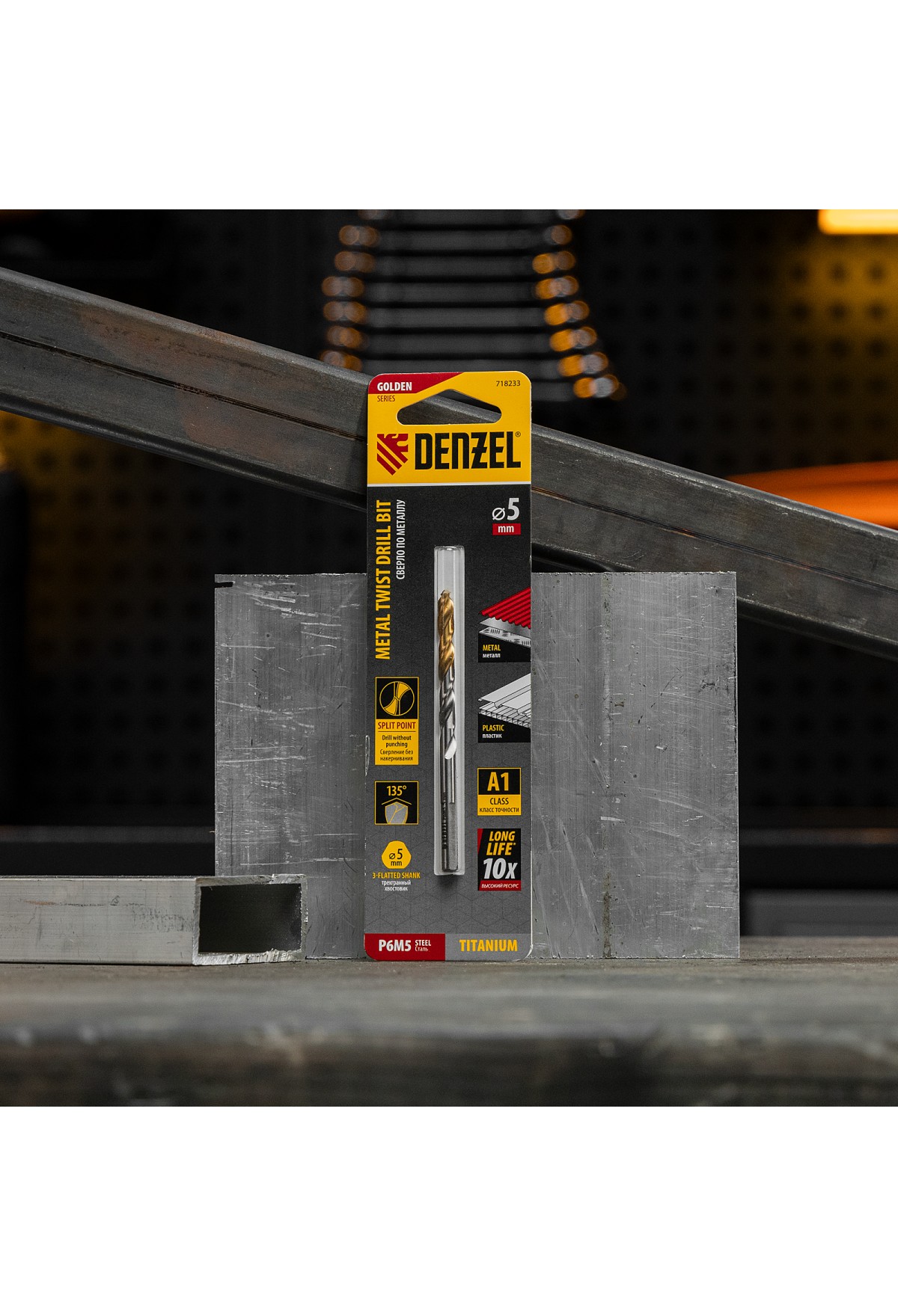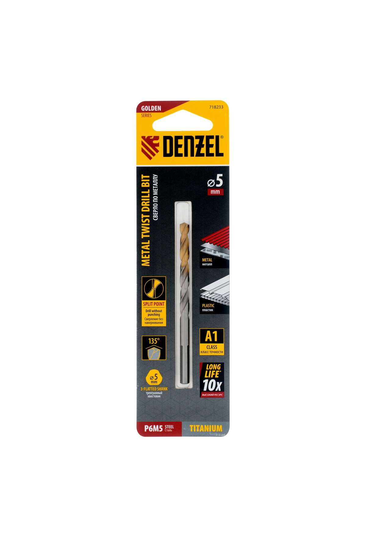 Спиральное сверло по металлу Denzel Golden Tip 718233 из стали P6M5, размером 5 х 86 мм, предназначено для получения отверстий в легированных и цветных металлах — меди, алюминии, мягкой бронзе, титане, латуни. Оснастка позволяет эффективно справляться с поставленными задачами благодаря оптимальному углу заточки 135°. Класс точности A гарантирует высокое качество полученных отверстий. Сверло используется для проведения монтажно-сборочных работ.