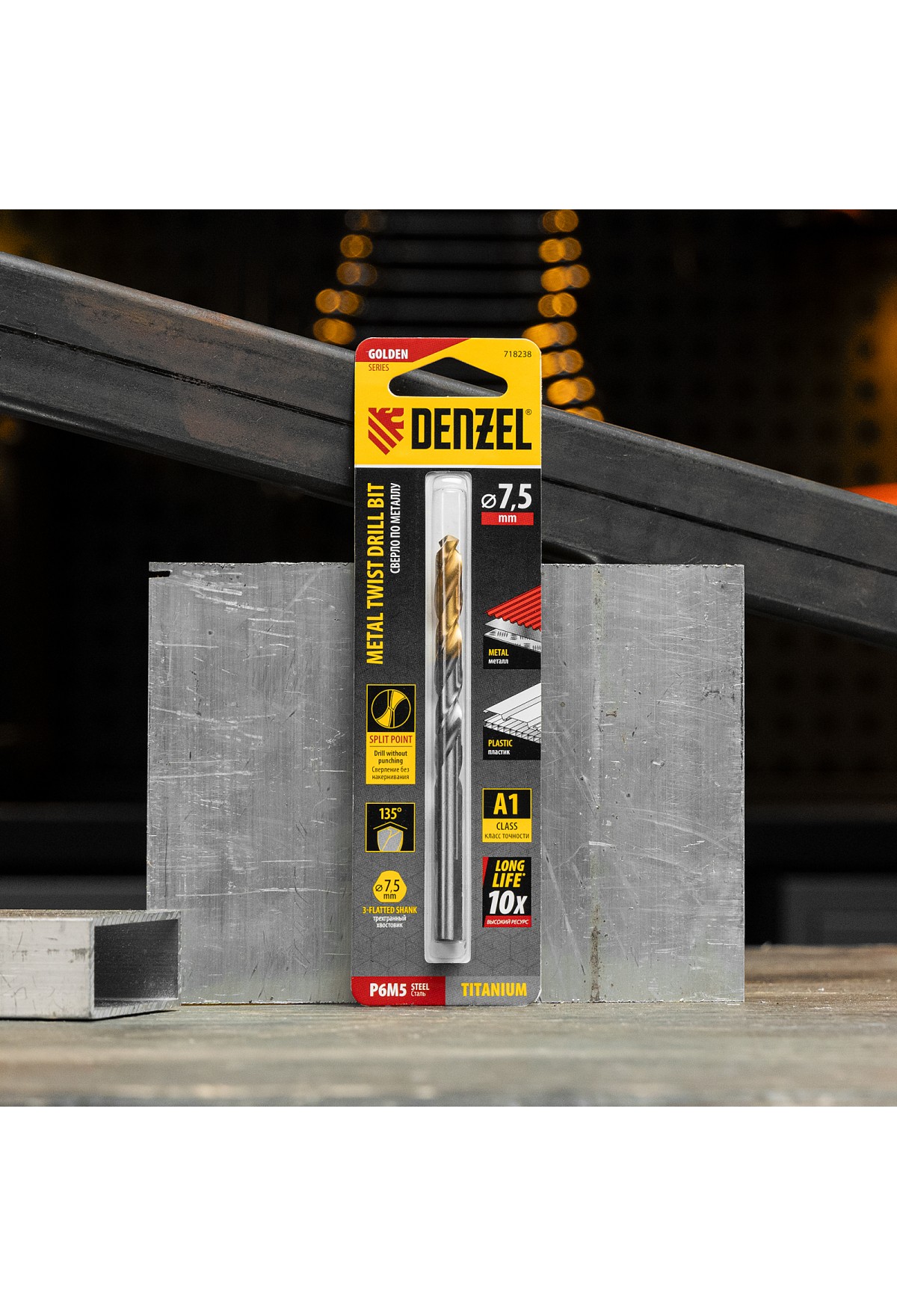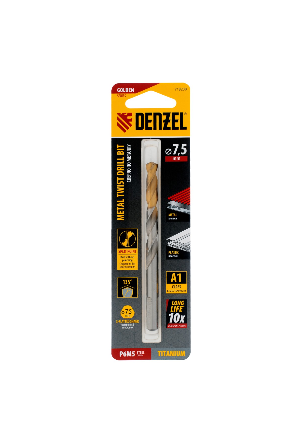 Спиральное сверло по металлу Denzel Golden Tip 718238 из стали P6M5, размером 7,5 х 109 мм, предназначено для получения отверстий в легированных и цветных металлах — меди, алюминии, мягкой бронзе, титане, латуни. Оснастка позволяет эффективно справляться с поставленными задачами благодаря оптимальному углу заточки 135°. Класс точности A гарантирует высокое качество полученных отверстий. Сверло используется для проведения монтажно-сборочных работ.