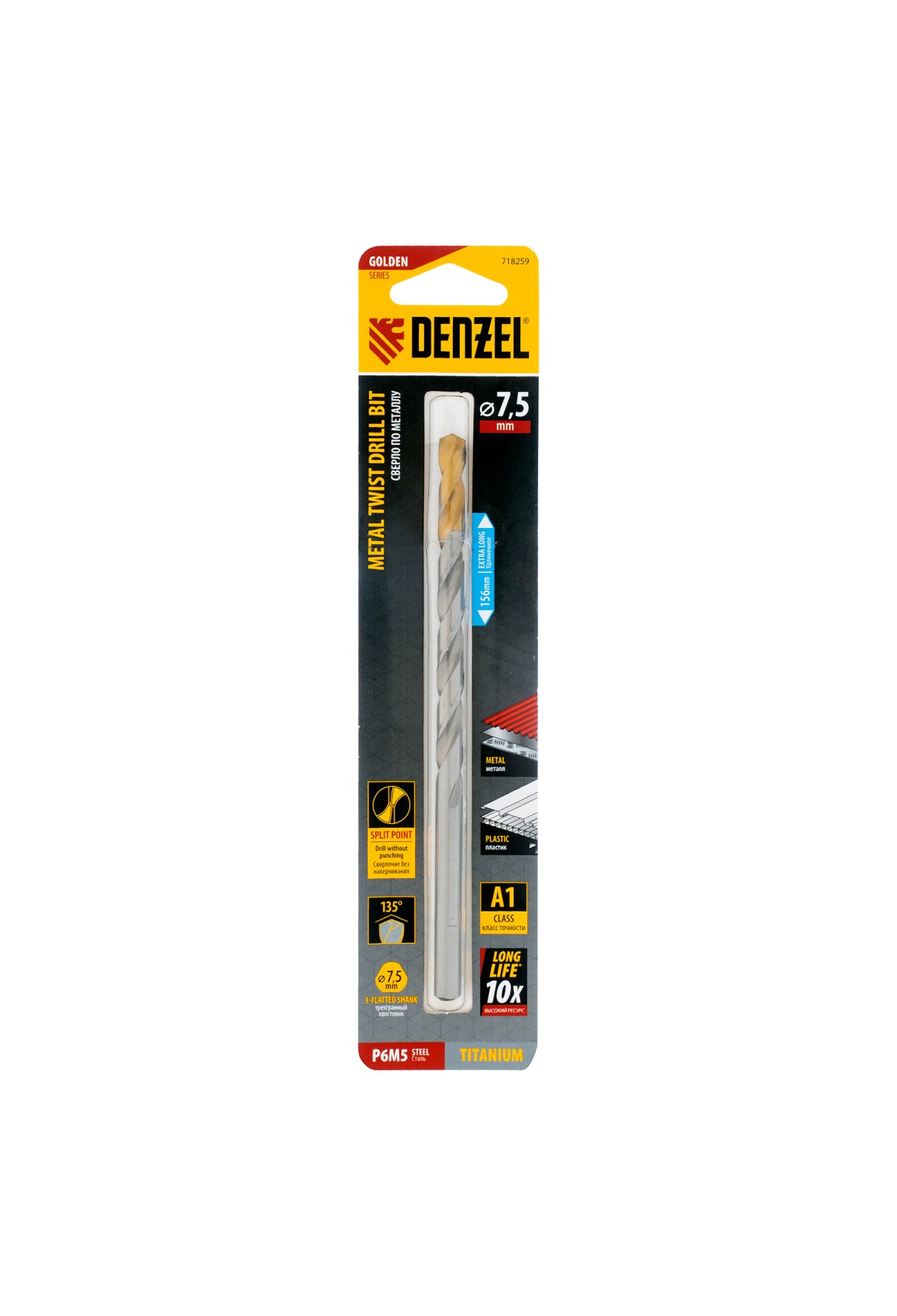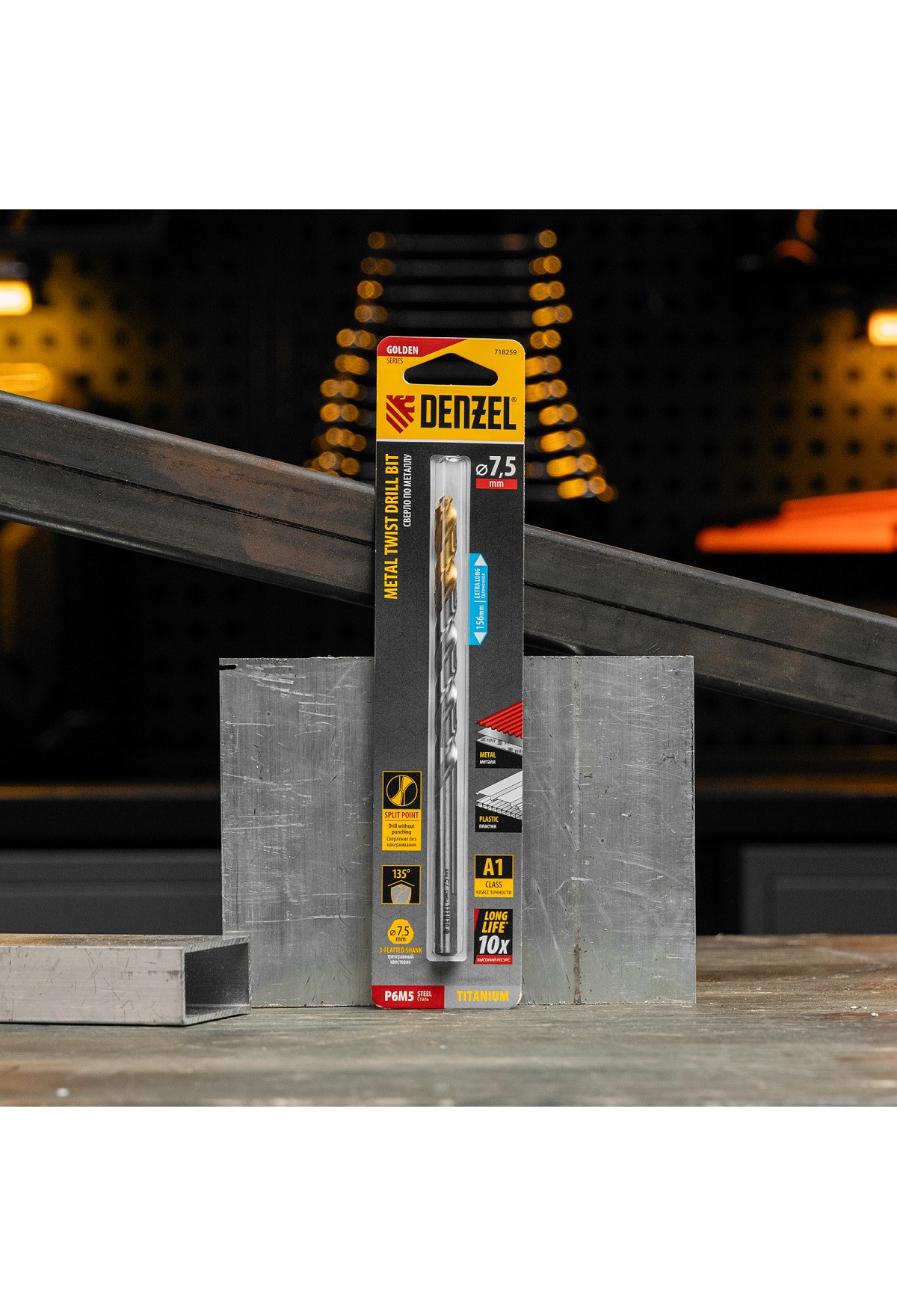 Удлиненное спиральное сверло по металлу Denzel Golden Tip 718259 из стали P6M5, размером 7,5 х 156 мм, предназначено для получения отверстий в легированных и цветных металлах — меди, алюминии, мягкой бронзе, титане, латуни. Оснастка позволяет эффективно справляться с этими задачами благодаря оптимальному углу заточки 135°. Класс точности A гарантирует высокое качество работ, а удлиненный профиль позволяет сверлить глубокие отверстия. Сверло используется для проведения монтажно-сборочных работ.