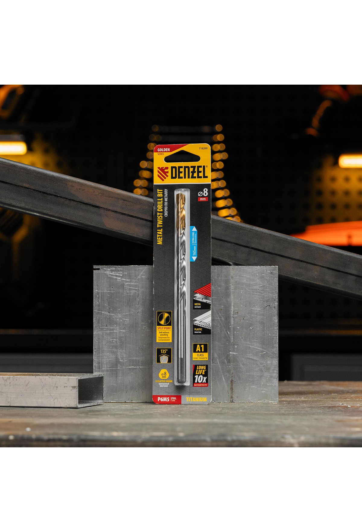 Удлиненное спиральное сверло по металлу Denzel Golden Tip 718260 из стали P6M5, размером 8 х 165 мм, предназначено для получения отверстий в легированных и цветных металлах — меди, алюминии, мягкой бронзе, титане, латуни. Оснастка позволяет эффективно справляться с этими задачами благодаря оптимальному углу заточки 135°. Класс точности A гарантирует высокое качество работ, а удлиненный профиль позволяет сверлить глубокие отверстия. Сверло используется для проведения монтажно-сборочных работ.