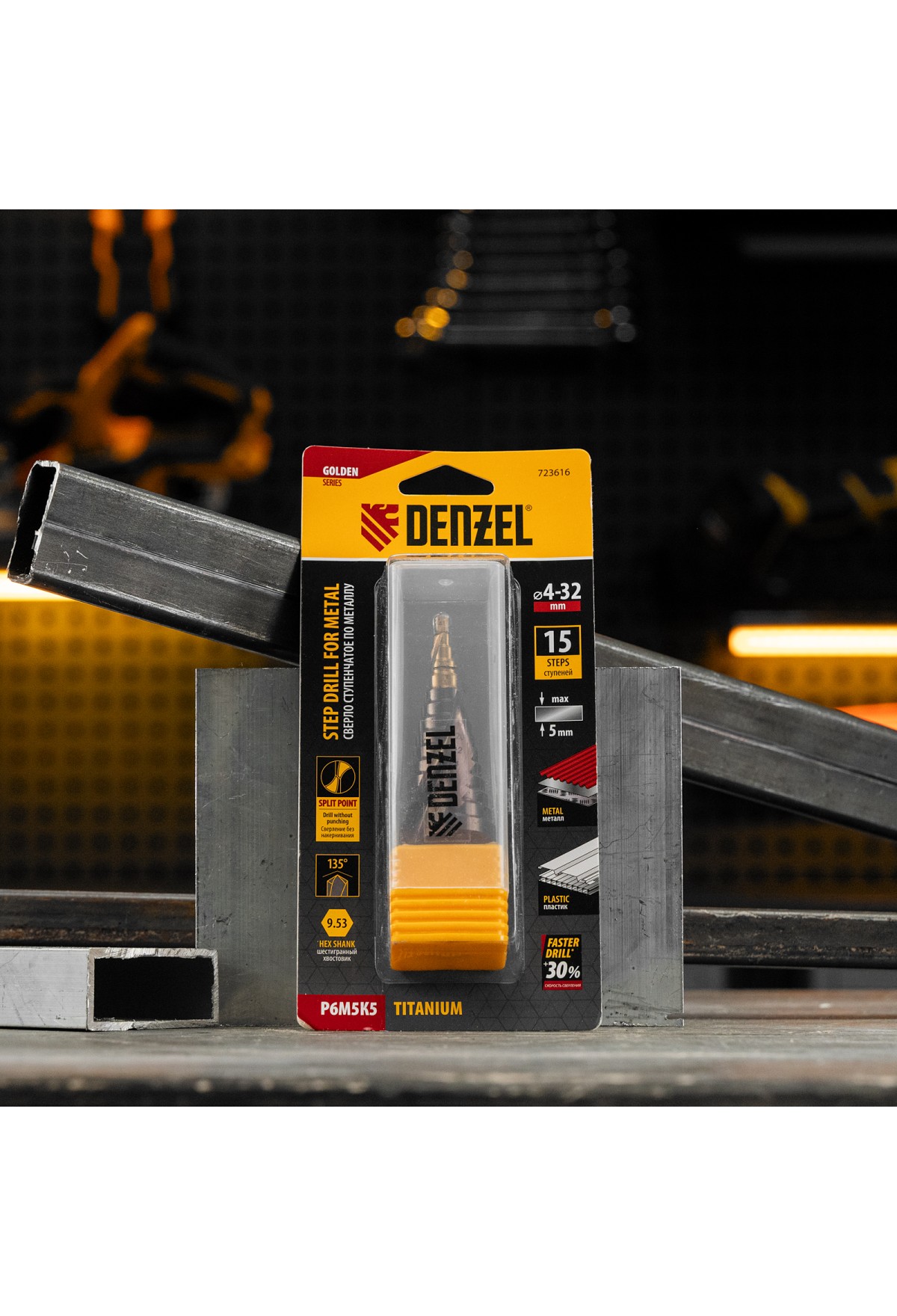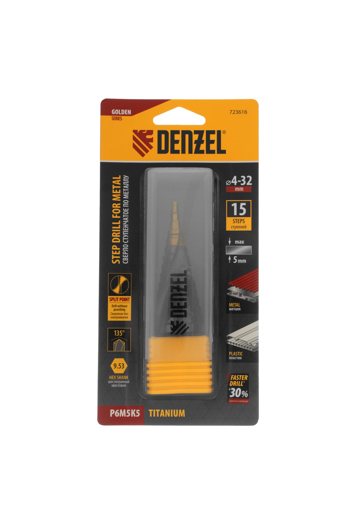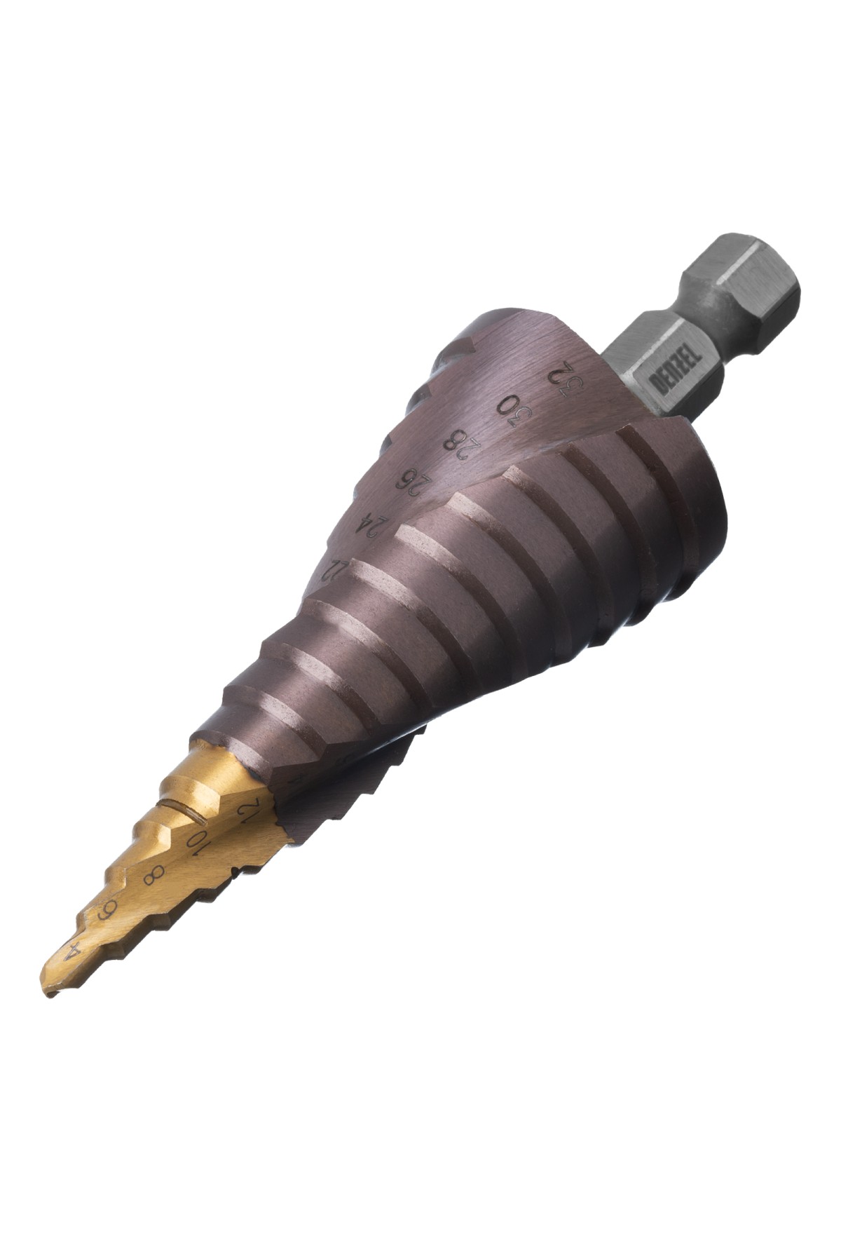 Ступенчатое сверло Denzel 723616 из стали P6M5K5, с 6-гранным хвостовиком, предназначено для сверления отверстий диаметром от 4 до 32 мм в сталях, цветных металлах и пластике. Избавляет от необходимости иметь при себе целый набор традиционных сверл. Позволяет получать отверстия с ровными краями и уже снятой фаской под гайку или болт. Оснастке присвоен класс точности A1. Сверло пригодится дома и в мастерской.