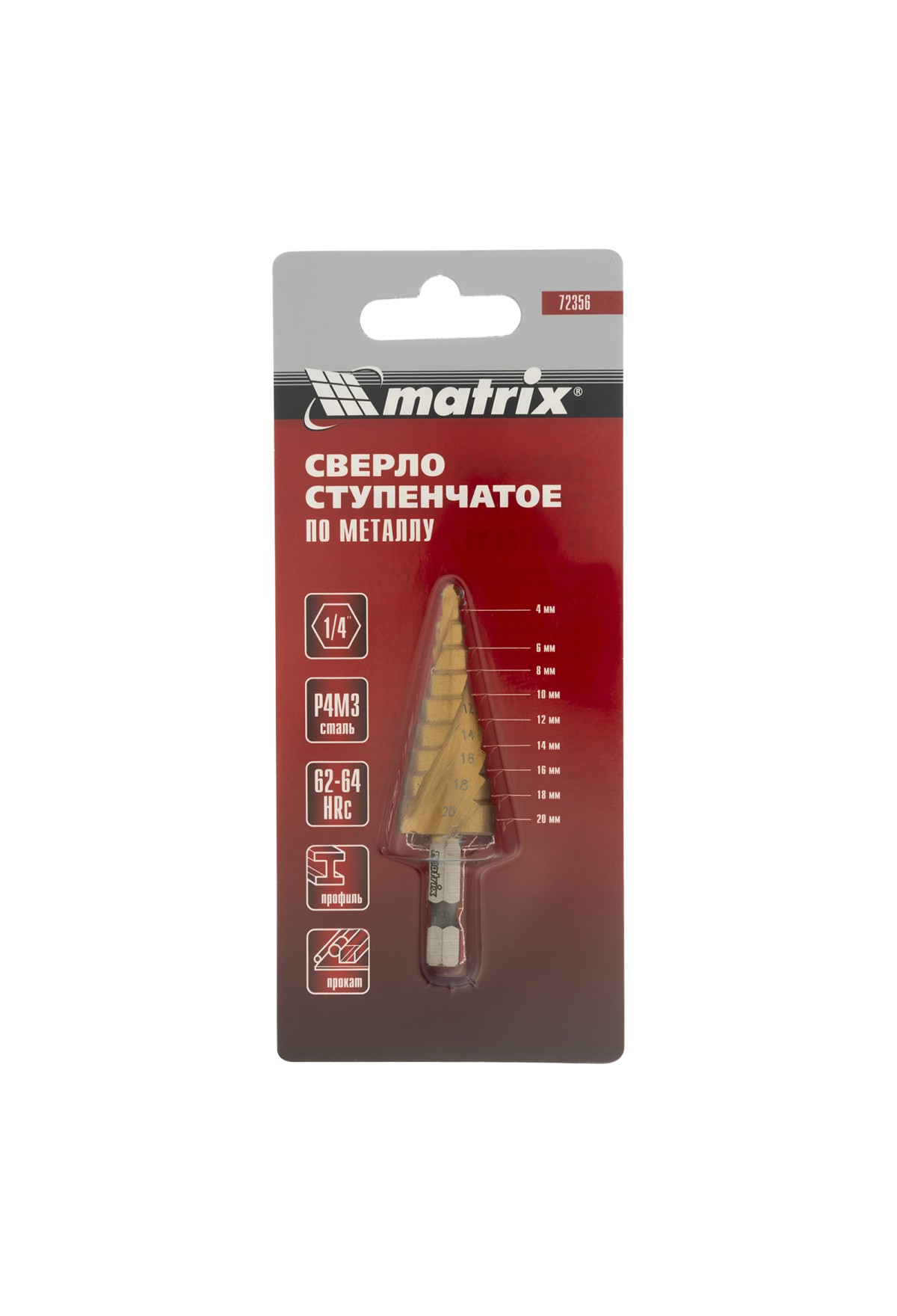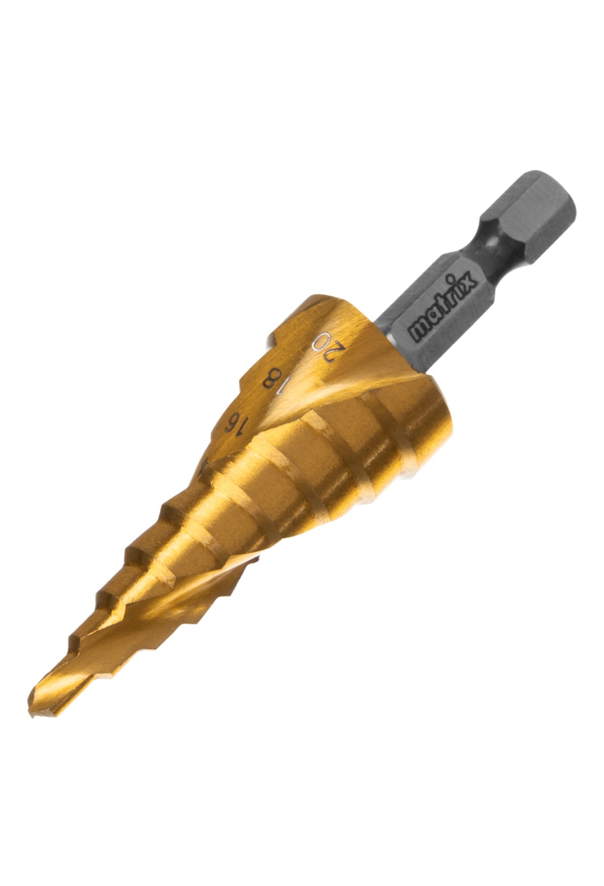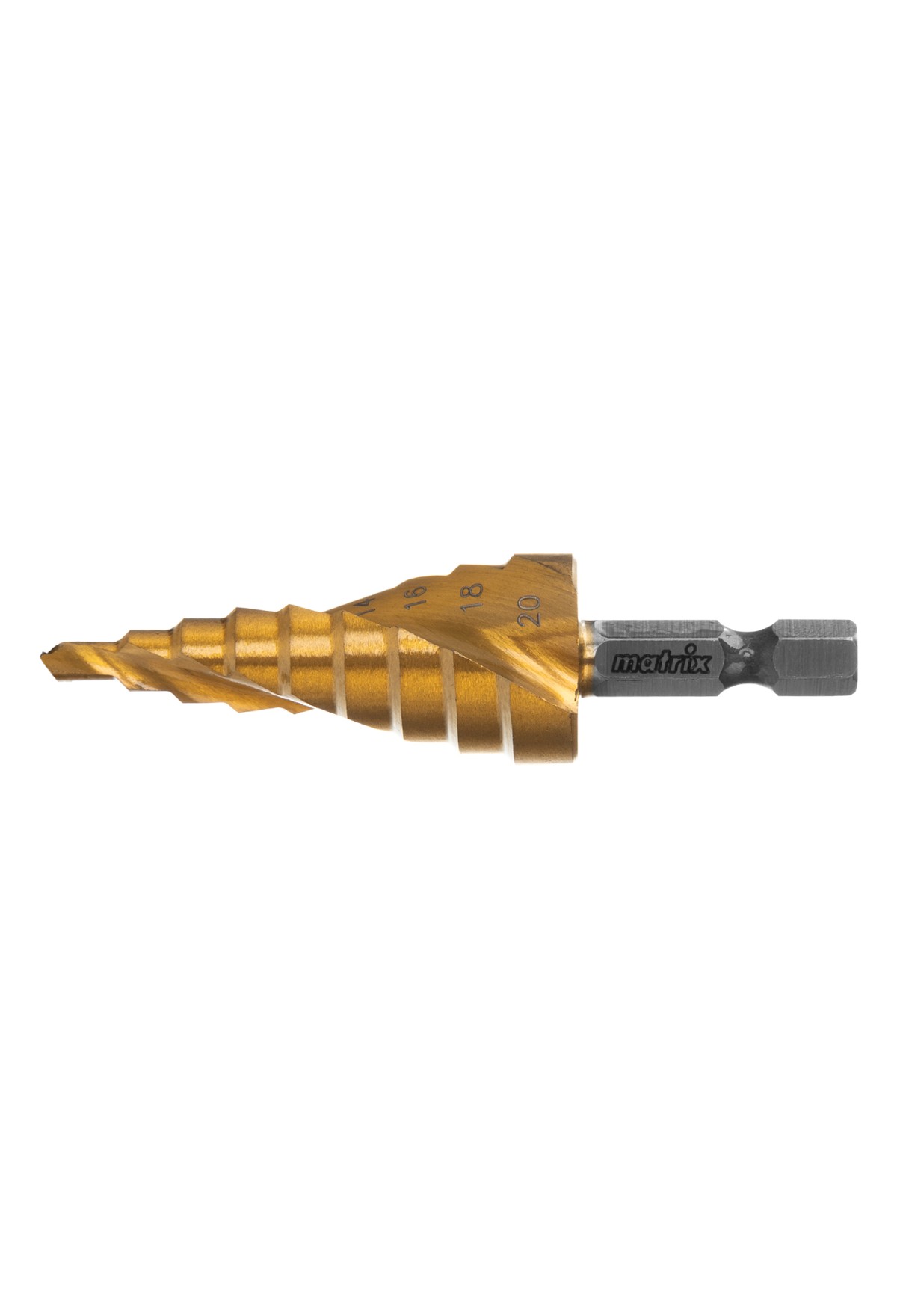 • Сверло ступенчатое, 4-6-8-10-12-14-16-18-20 мм, HSS, спиральный профиль, шестигранный хвостовик Matrix