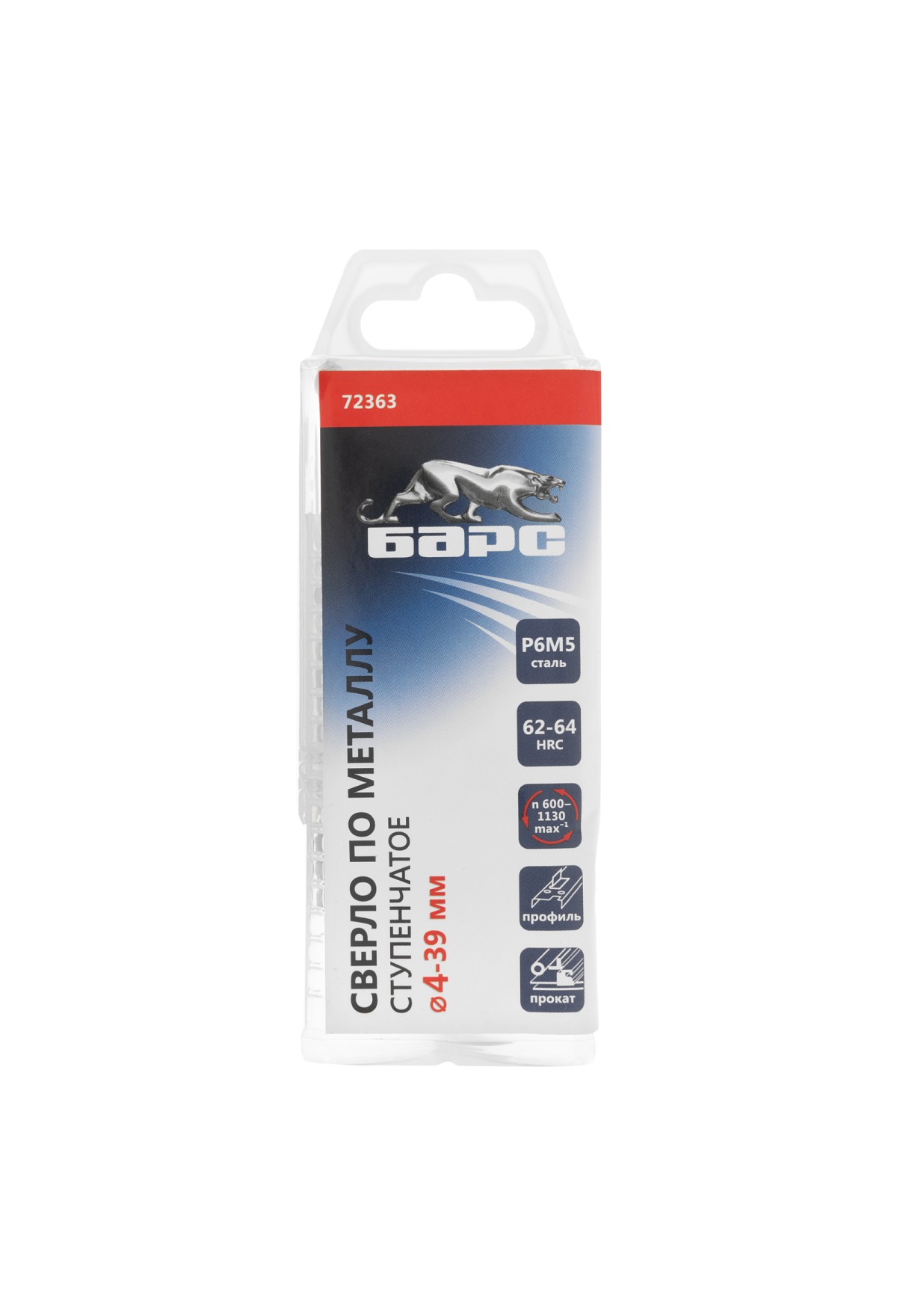 Ступенчатое сверло по металлу Барс 72363 из стали P6M5, с трехгранным хвостовиком, используется для получения в металлических заготовках отверстий диаметром 4-6-9-12-15-18-21-24-27-30-33-36-39 мм. Заменяет целый набор традиционных спиральных сверл. Оснастка позволяет снять фаску во время сверления, получив отверстие с ровными краями под гайку или болт. Сверло будет полезно для выполнения монтажно-сборочных работ.