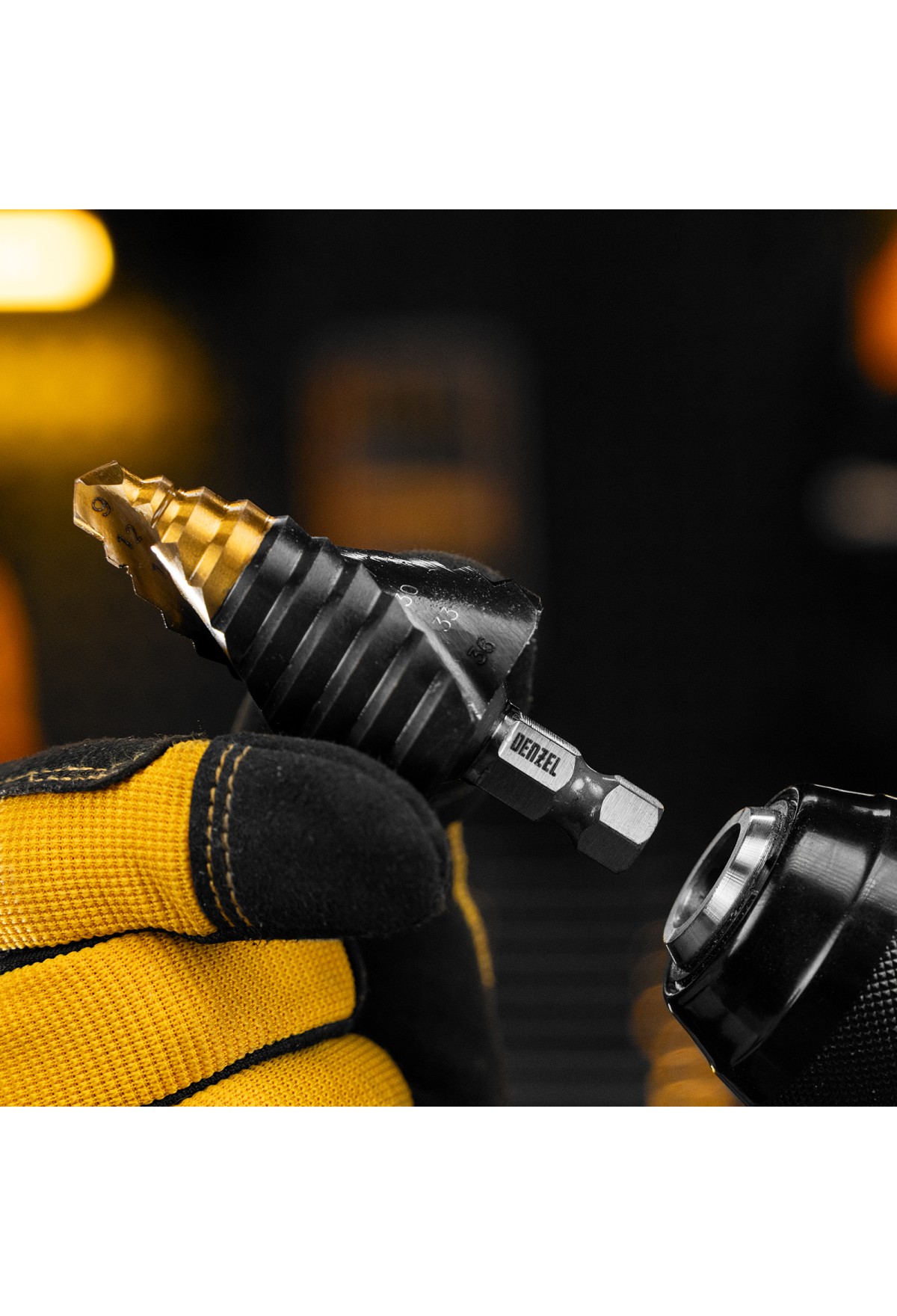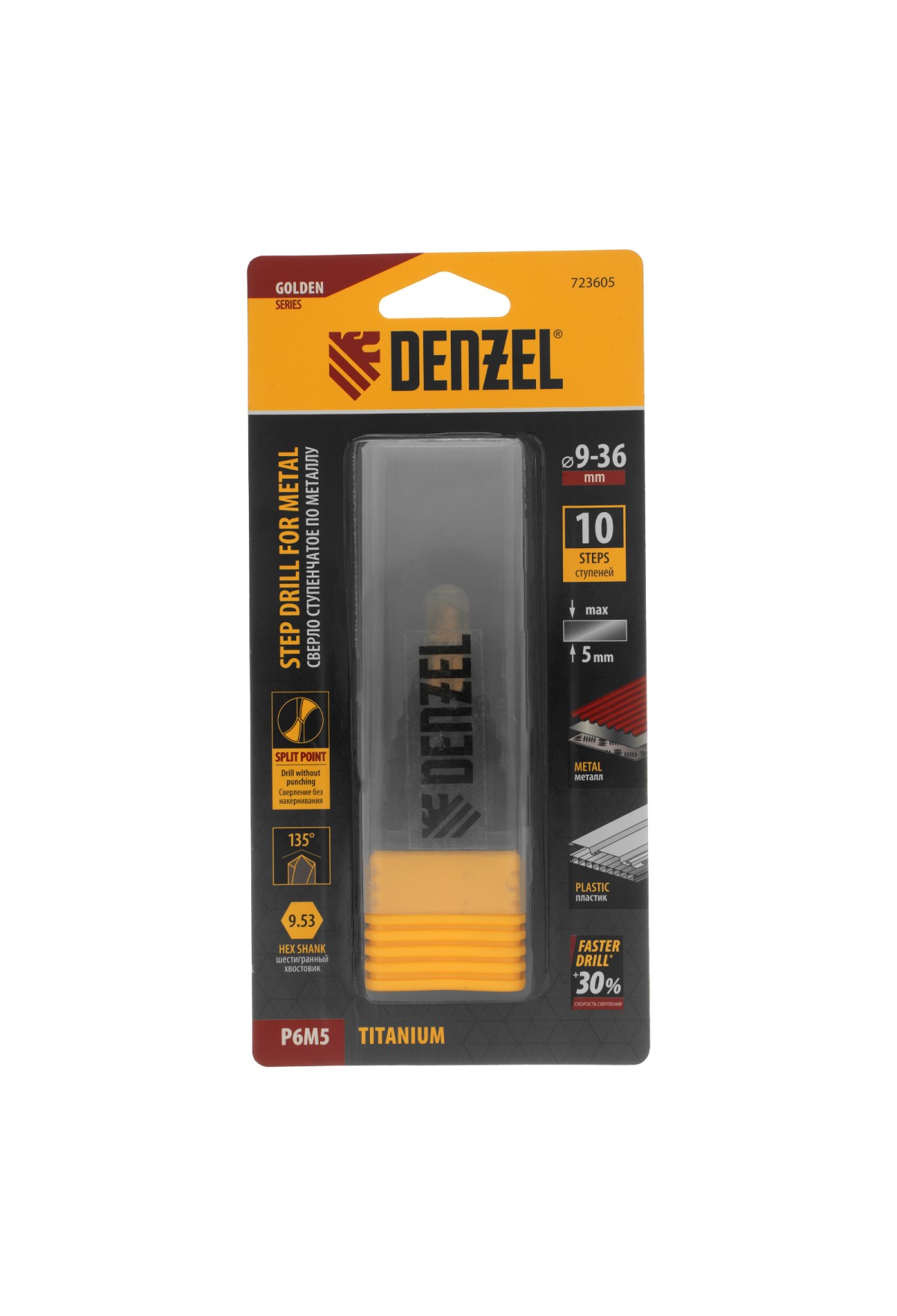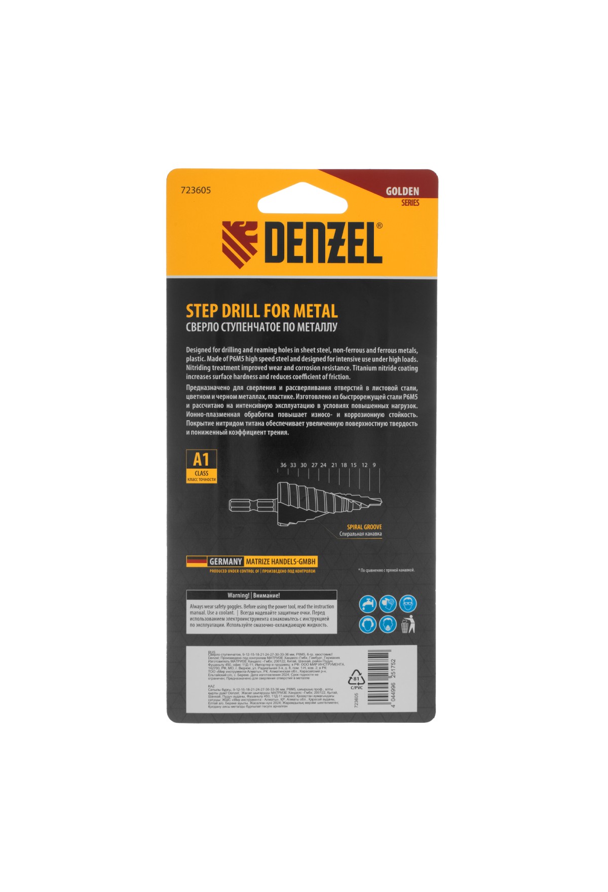 Ступенчатое сверло Denzel 723605 из стали P6M5, с 6-гранным хвостовиком, предназначено для сверления отверстий диаметром от 9 до 36 мм в сталях, цветных металлах и пластике. Избавляет от необходимости иметь при себе целый набор традиционных сверл. Позволяет получать отверстия с ровными краями и уже снятой фаской под гайку или болт. Оснастке присвоен класс точности A1. Сверло пригодится дома и в мастерской.